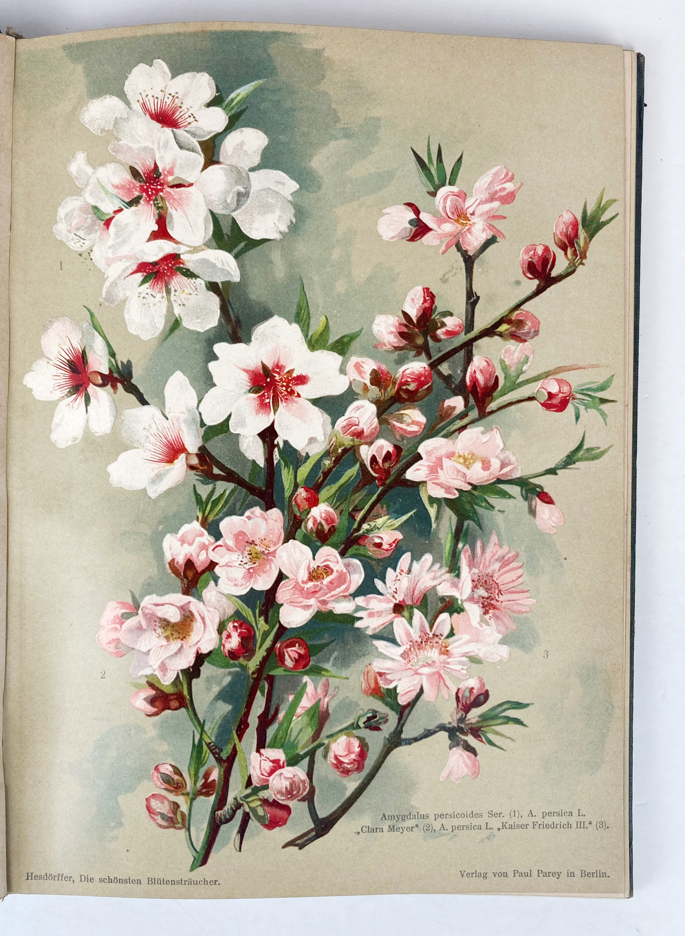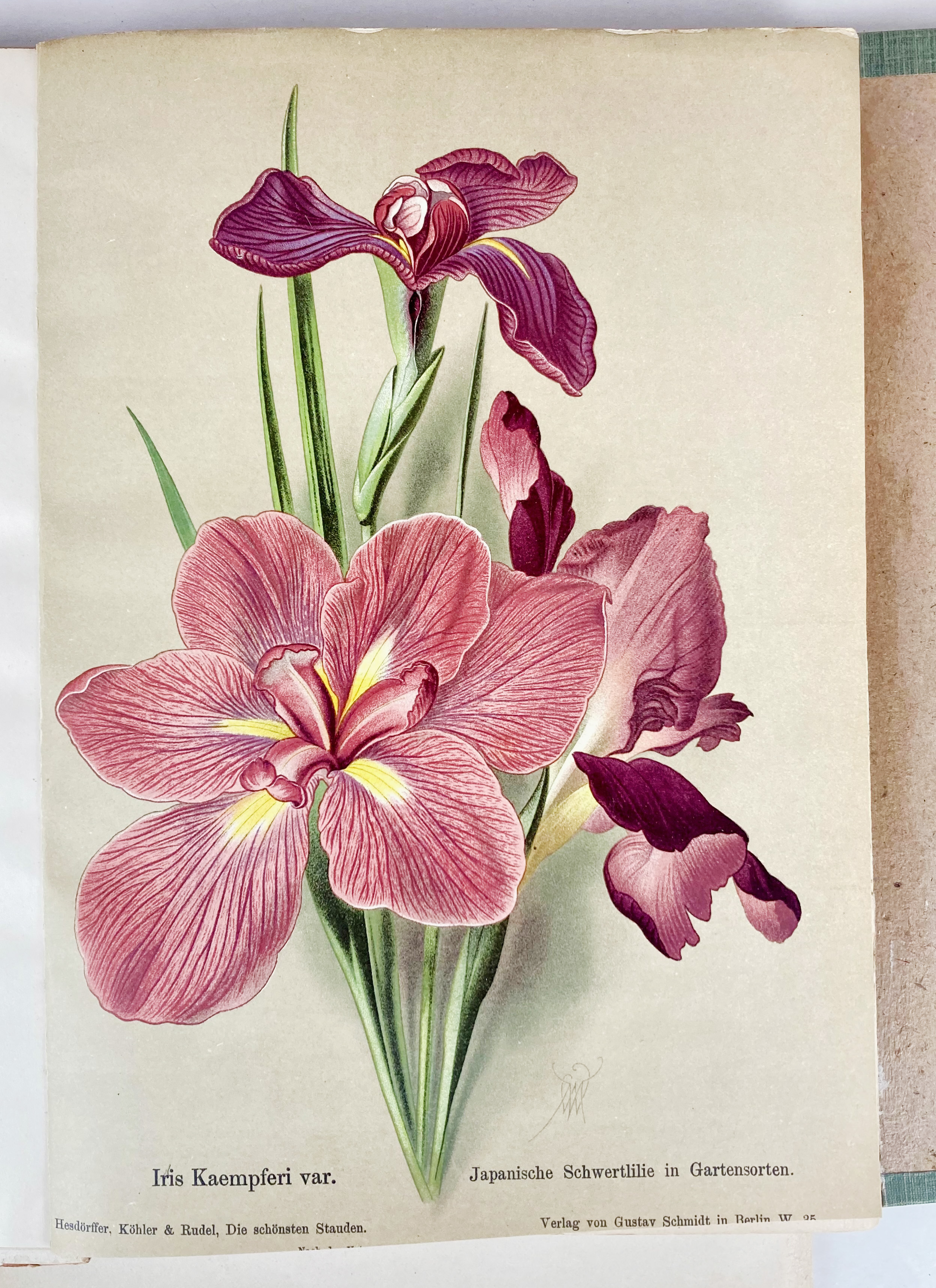 BOTANY -- HESSDÖRFFER, M. Die schönsten Blüten-Sträucher. Berl., 1905. W. 24 cold. plates, each w. c. 2 pp. of text. 4°. Ohcl. w. pictorial front side. (Wear to extremities, plates gorgeous & well-preserved). -- Id. Die schönsten Stauden für die Schnittblumen- u. Gartenkultur. Berl., 1900. Complete vol. in 12 installments, containing 4 splendidly cold. plates each (= total 48 plates), all of them w. c. 2 pp. of text. 4°. Installments in owrps, loose as issued, w. ocl. pictorial cover. -- Added: Id. Een keur van Bloemheesters. Bew. door E.Th. Witte. Leid., (1905). W. 24 cold. plates. 4°. Or. pictorial cl. -- Id. Een keur van Vaste-Planten geschikt voor Snijbloemen en cultuur in den tuin. Leid., (1900). W. 48 cold. plates. 4°. Rebacked in cl. w. use of or. spine & pictorial front side. -- (4).