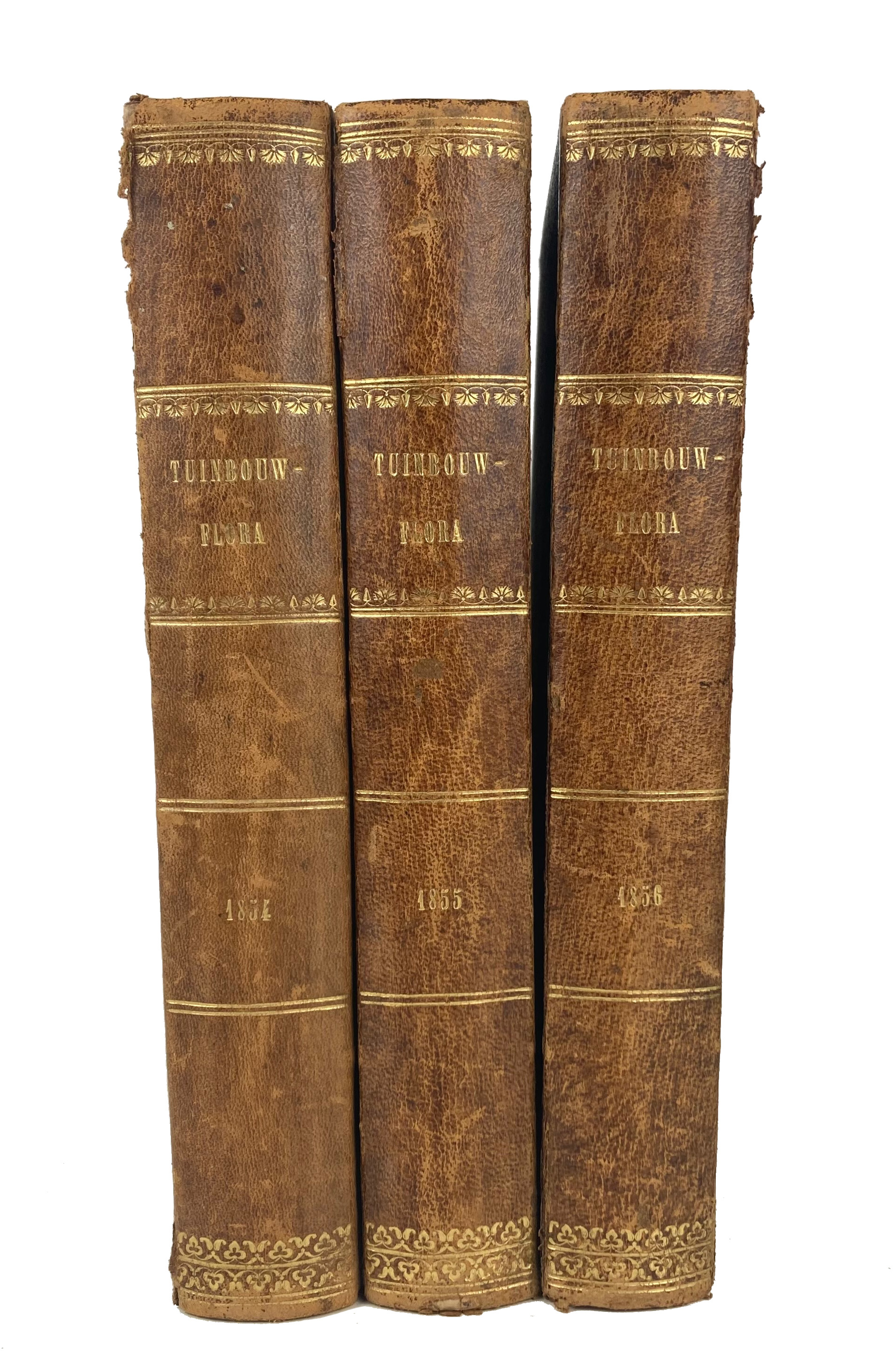 BOTANY -- VRIESE, W.H. de. Tuinbouw-flora van Nederland en zijne overzeesche bezittingen; bevattende de geschied. en afbeeldingen v. nieuwe of merkwaardige planten, bloemen, vruchten, (...). Leiden, 1855-56. 3 vols. W. cold. front. lithogr., 38 lithog. plates: 16 fold. (14 cold.), 6 double-p. (5 cold.), 16 full-p. (6 cold.). Cont. hcf. w. gilt lettering on spine, a.e.g. (Hinges of all vols. partly split, wear to extremities, some age-toning throughout, a few of the plates bound in unexpected places).