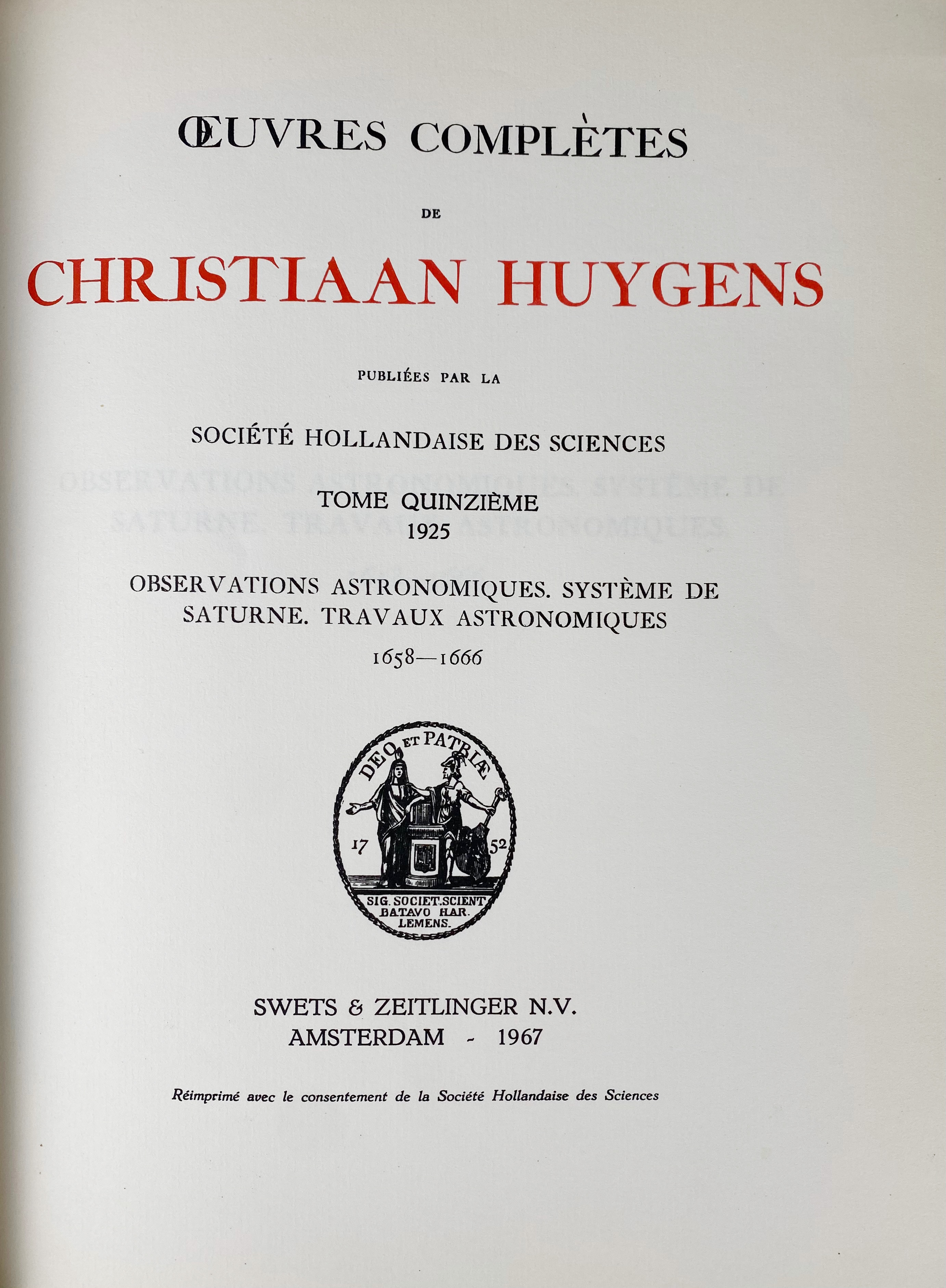 HUYGENS, Chr. Observations astronomiques. Système de Saturne. Travaux astronomiques 1658-1666. (Repr. ed. 1925. Amst., 1967). W. ills. 4°. Artificial leather w. gilt lettering (AVH = Anton van Helden) & silk endpapers. (Oeuvres Compl. Tom XV). -- Id. The pendulum clock or geometrical demonstrations concerning the motion of pendula as applied to clocks. Transl. w. notes by R.J. Blackwell. Introd. by H.J. M. Bos. (1986). Ocl. w. dust-j. -- Id. F.J. DIJKSTERHUIS. Lenses & waves. Christiaan Huygens and the mathematical science of optics in the 17th c. (2004). Obrds. -- J.G. YODER. Unrolling times. Christiaan Huygens and the mathematization of nature. (1988). Ocl. W. author's autograph dedication. -- (4).