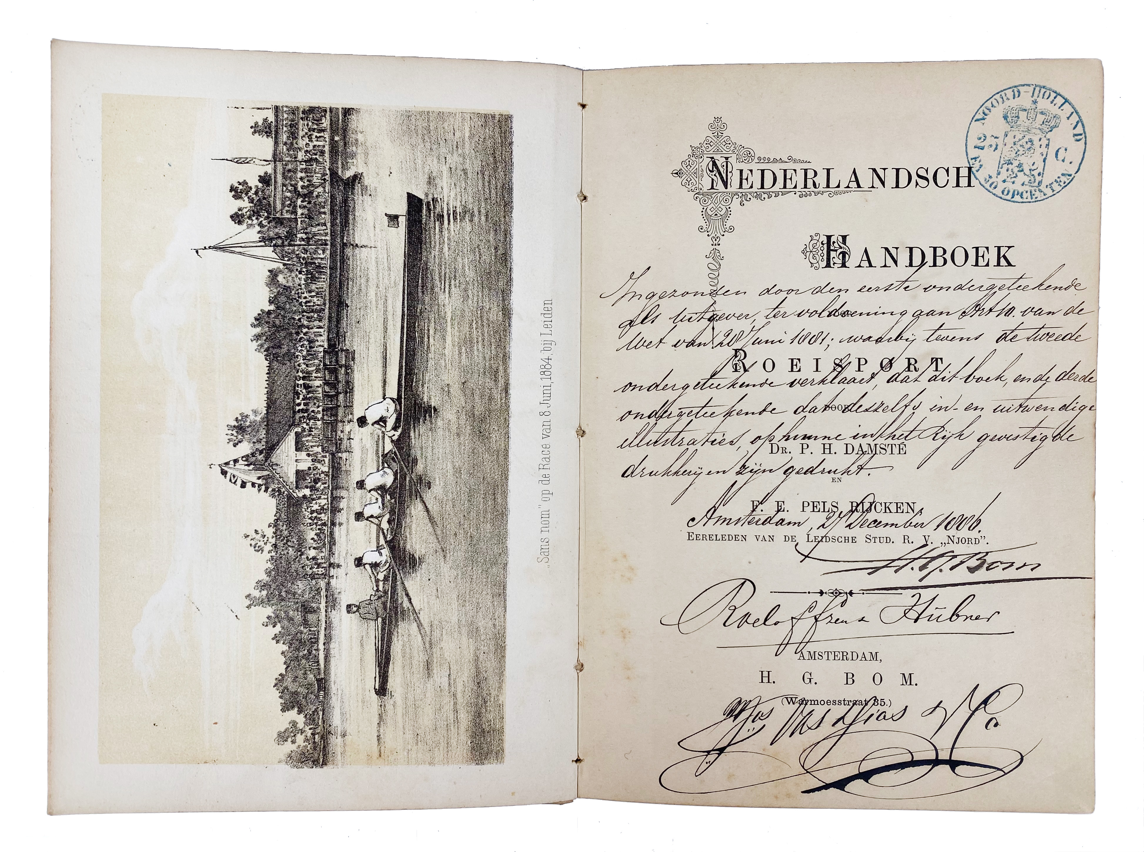 DAMSTÉ, P.H. & F.E. PELS RIJCKEN. Nederlandsch handboek voor roei-sport. Amst., H.G. Bom, (1886). (8), 136 pp. W. tinted lithogr. front. Or. pictorial cl.