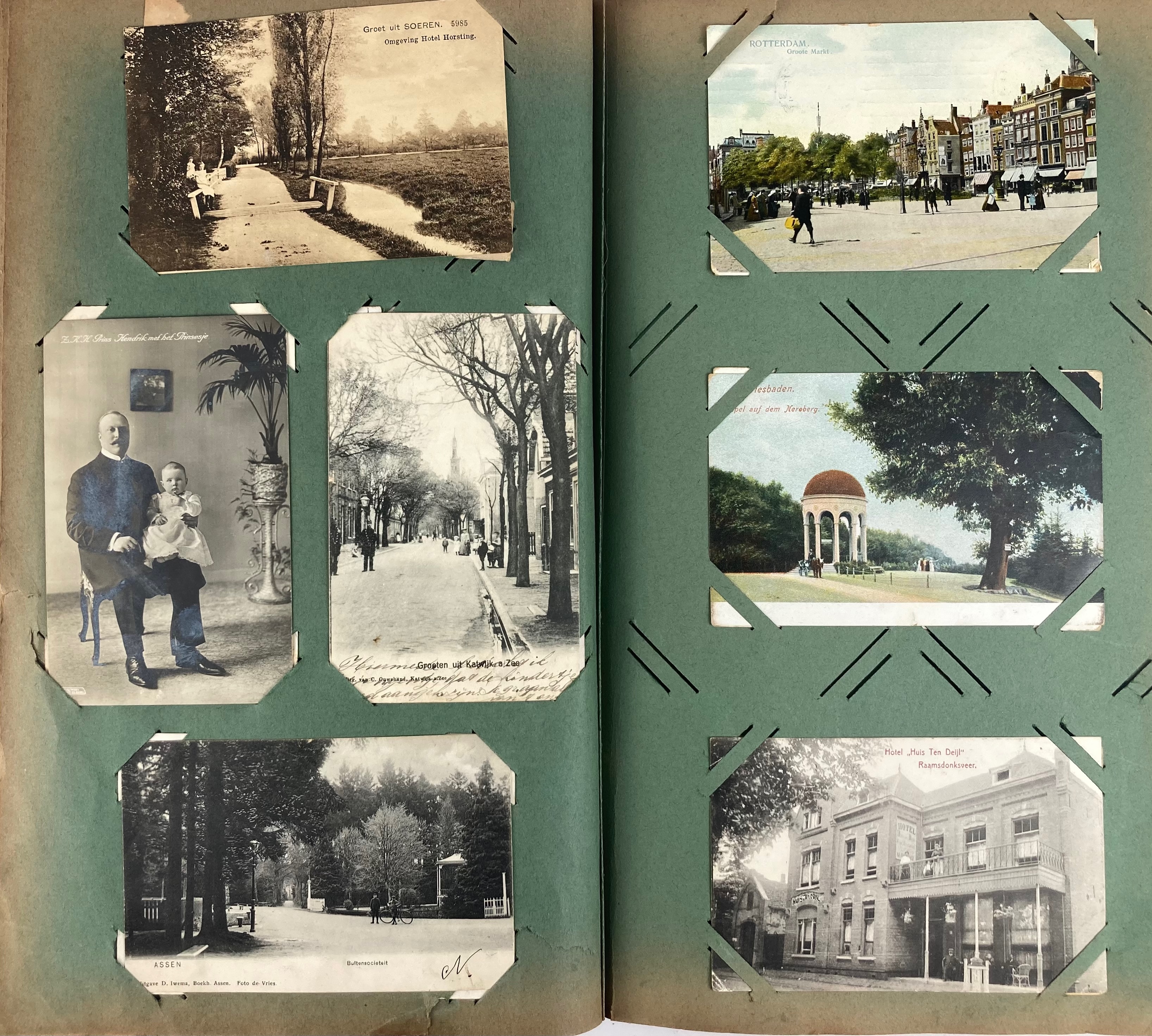 COLLECTION of c. 980 topographical postcards of the Netherlands and of foreign countries (i.a. USA, Germany), incl. some 'fantasy' and seasonal cards, b&w and coloured, 1900's-1930's. Partly circulated. Inserted in 3 (partly w. dam. interiors) albums, partly w. decorations on front sides, typical for the era. All from 1 source.