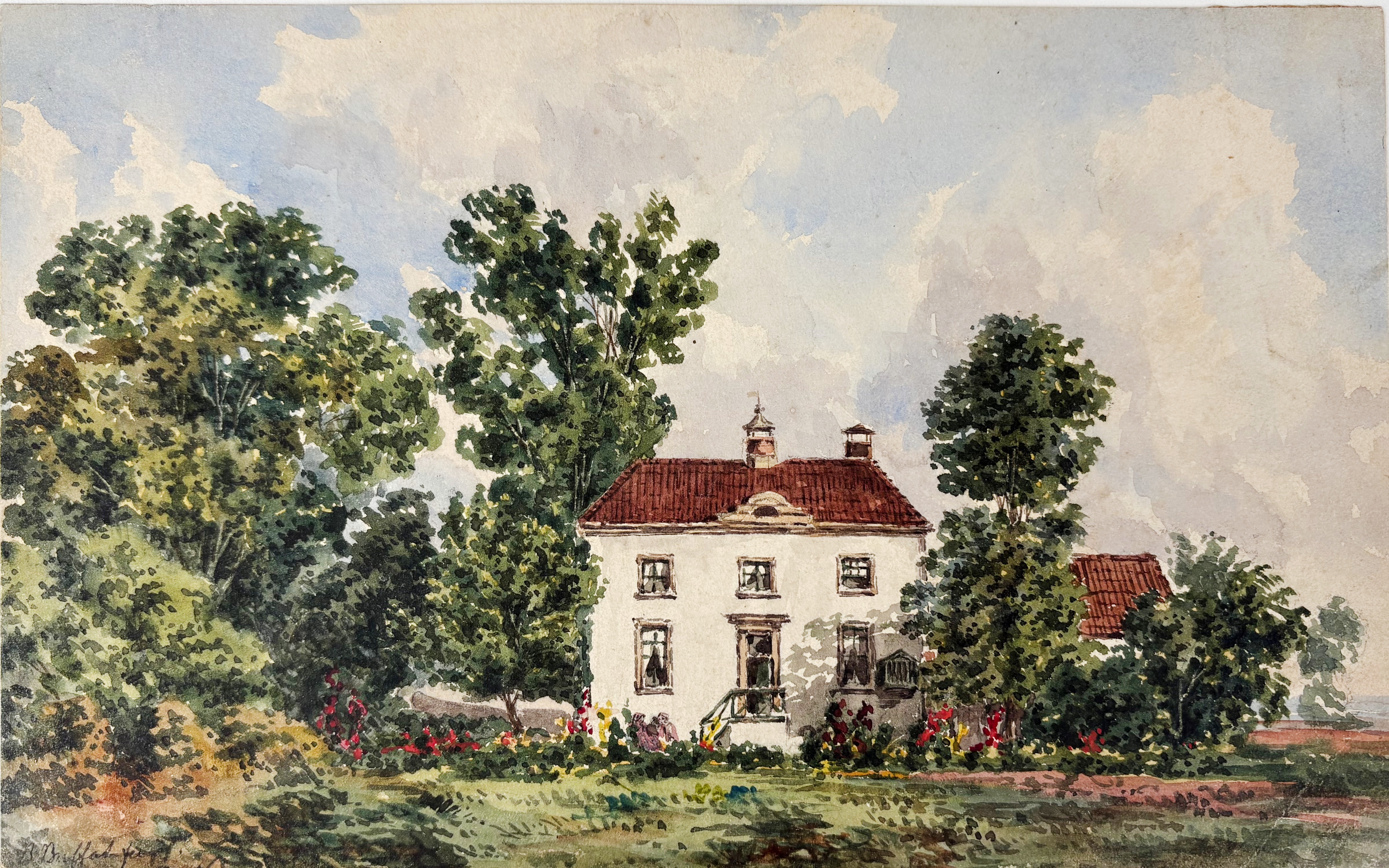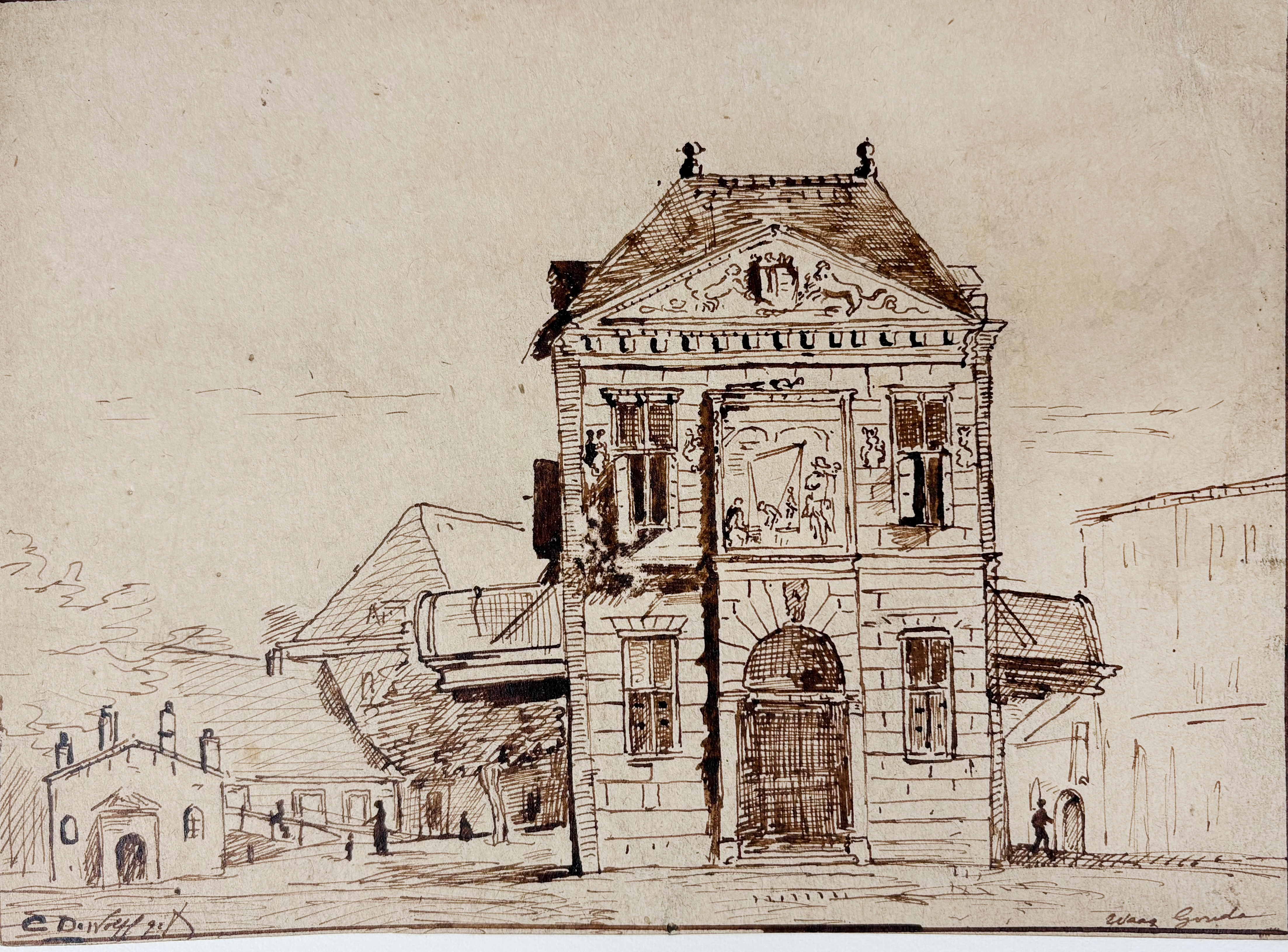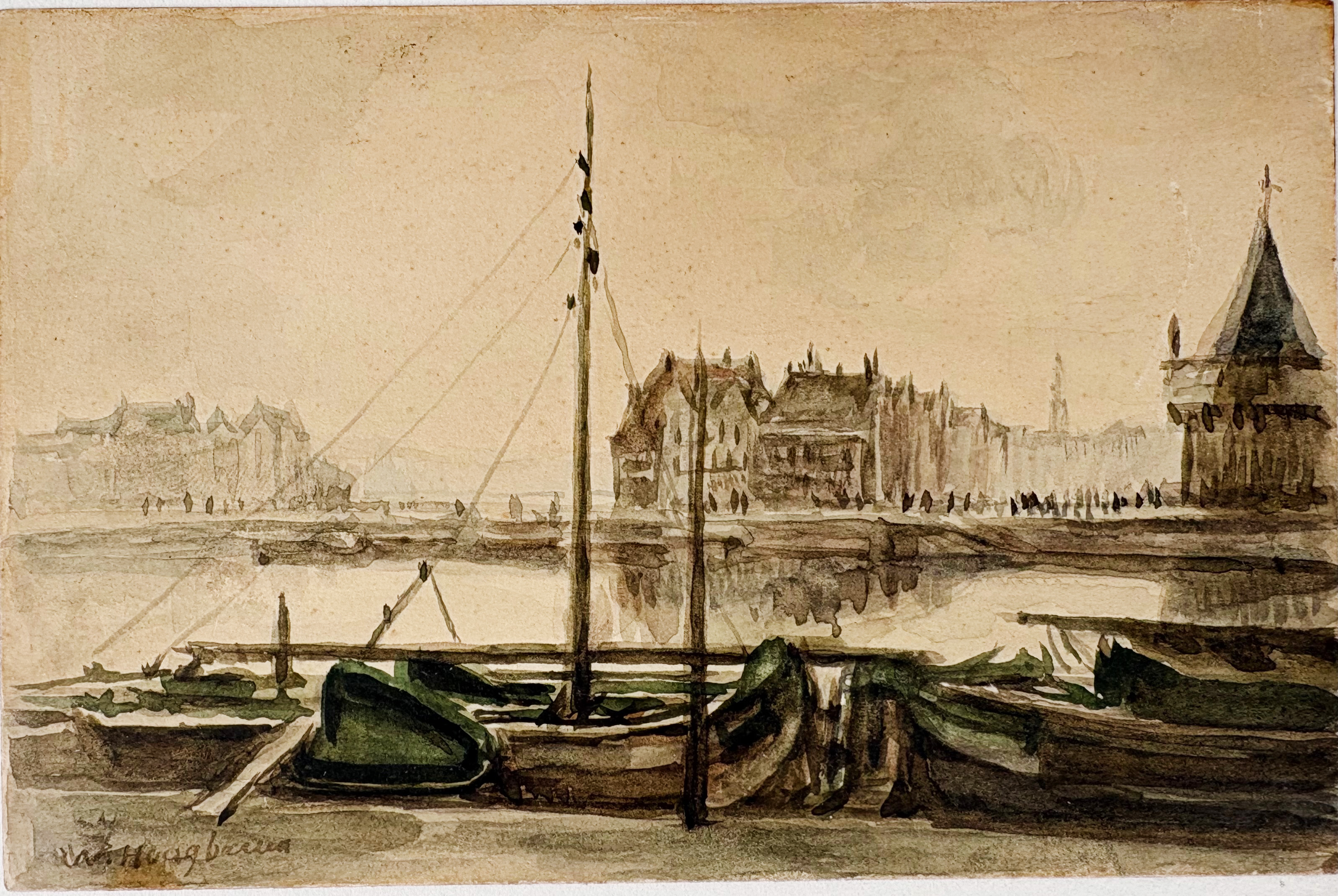 LOW COUNTRIES -- ENKHUIZEN -- WANING, Cornelis Anthonij ('Kees') v. (1861-1929). (Harbour scene view of Enkhuizen w. 'Dromedaris' in background). Drawing in black chalk. 195 x 270 mm. Signed in l.r. corner. Mounted along margins, under passepartout. -- W. HOOGBRUIN? (Amsterdam, view of the Schreyerstoren). N.d. Drawing in colour wash. 90 x 140 mm. Mounted along margins, under passepartout. -- And 2 o. (4).