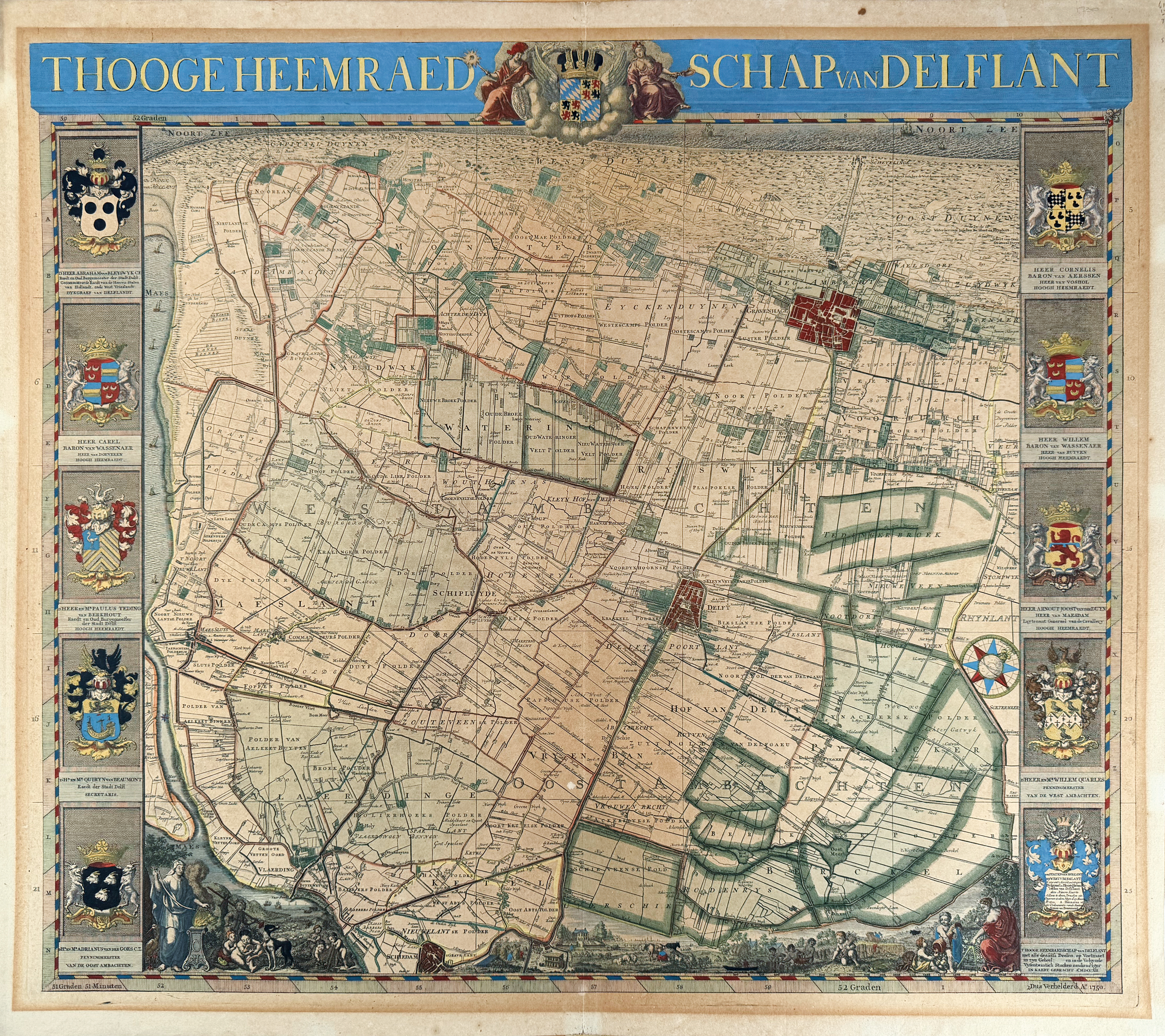 LOW COUNTRIES -- "THOOGE HEEMRAEDSCHAP van Delflant". N.pl., 1750. Engr. plain general map of polder district 'Delfland' by Van Anse, Doesburgh, (a.o.) after N. & J. Kruikius w. engr. title in top border and w. 10 fine engr. coats of arms by P. Haringh (5 on each outer side), all cold. by hand. 520 x 580 mm. (Browned, traces of former framing on v°.).