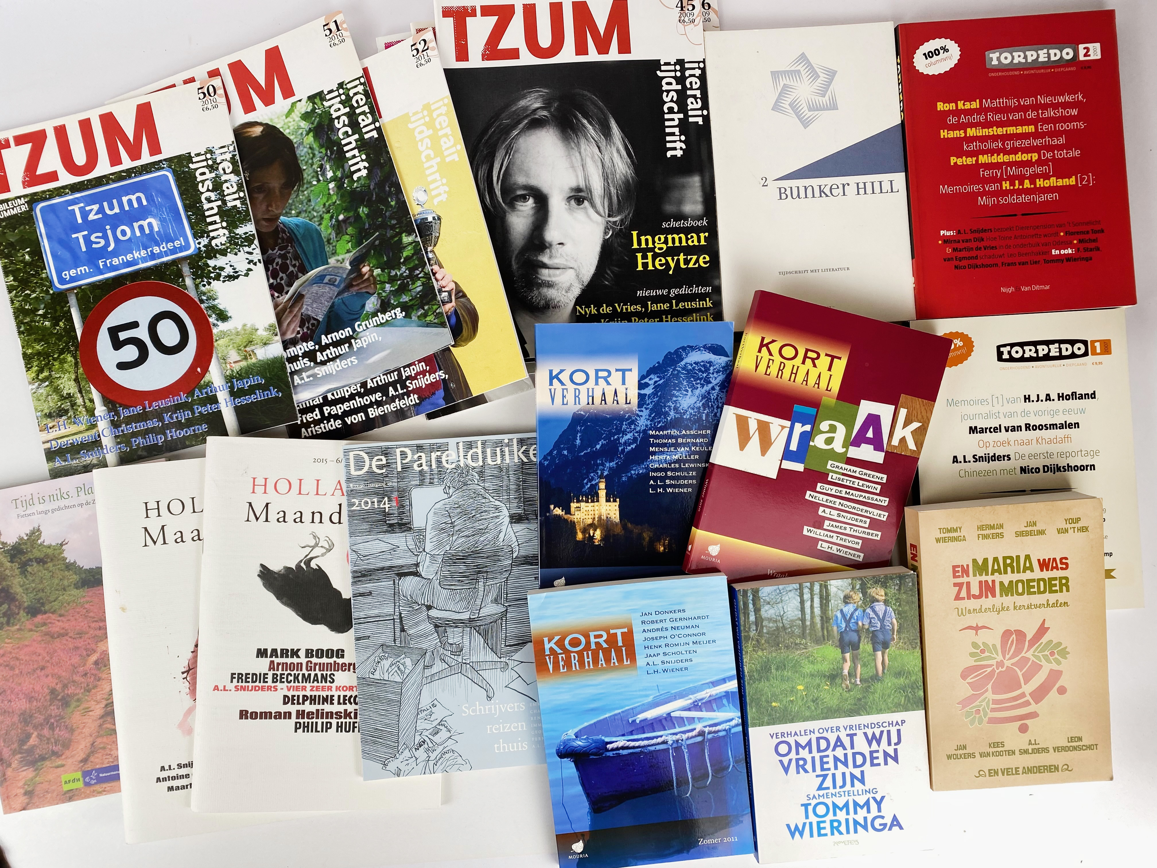 SNIJDERS, A.L. Heimelijke vreugde. Berichten aan een hoofdredacteur. 2007-08. 2 vols. Obrds. -- Id. 26 zkv. (2016). Sm-8°. Owrps. (Slibreeks). -- Id. Eenentwintig en andere varkensverhalen. 2016. Owrps. -- Id. Ruim water. (2012). Owrps. -- Id. Voordeel schutter. M. e. voorw. v. T. Wieringa. (2011). Owrps. -- Id. & E. HARTEVELD. Koude oorlog aan de IJssel. Roman in brieven. (2013). Obrds. -- M. ZEVEN. A.L. Snijders, meer dan een bibliografie. (2011). Owrps. (Wrps. sl. faded). -- HET JAAR van de omslag. Jaarverslag 2006 (SLO). With: Zeer korte onderwijsverhalen van A.J. Snijders. W. CD. Owrps. -- And 22 o. works/periodicals with contributions by A.J. Snijders. (31).