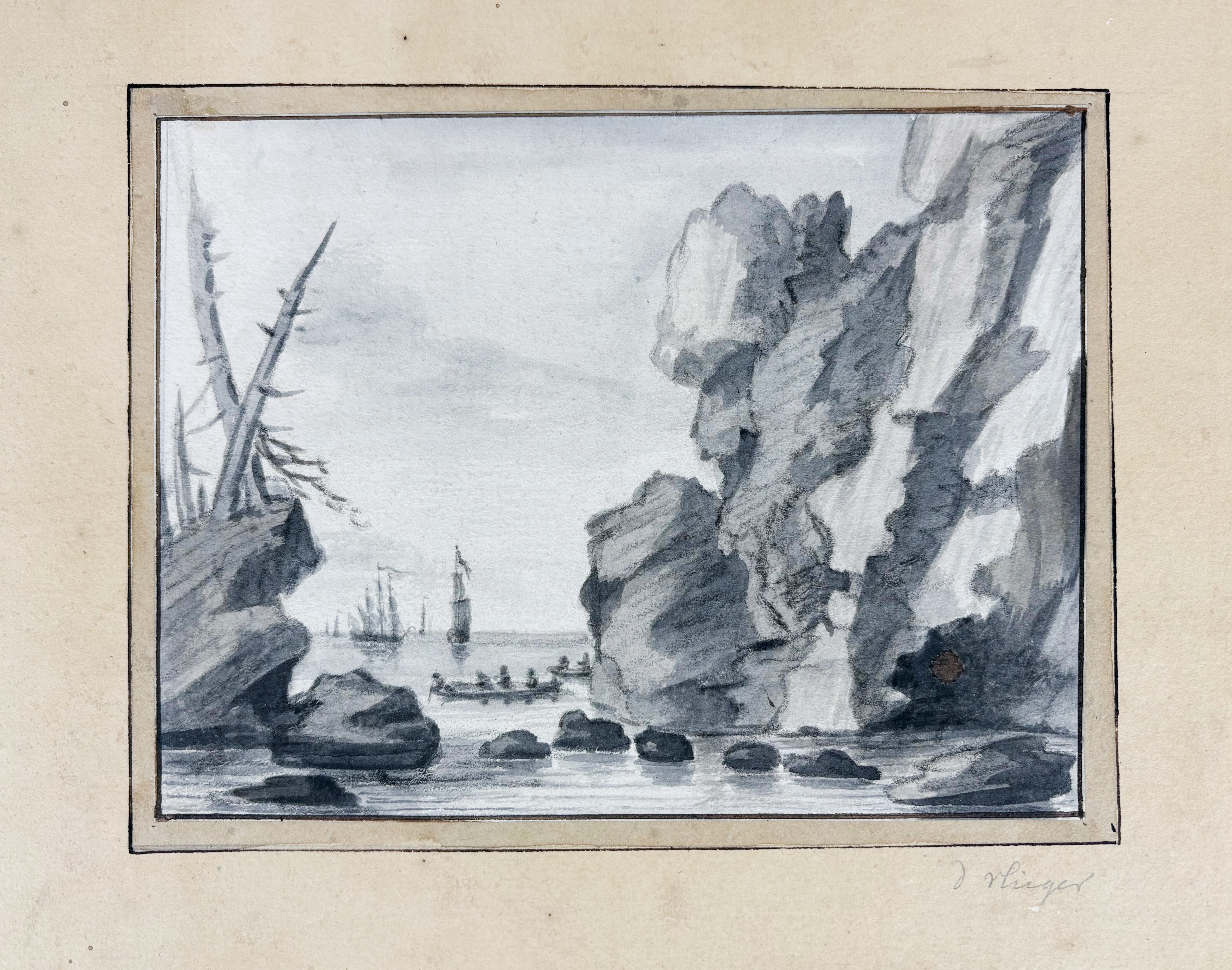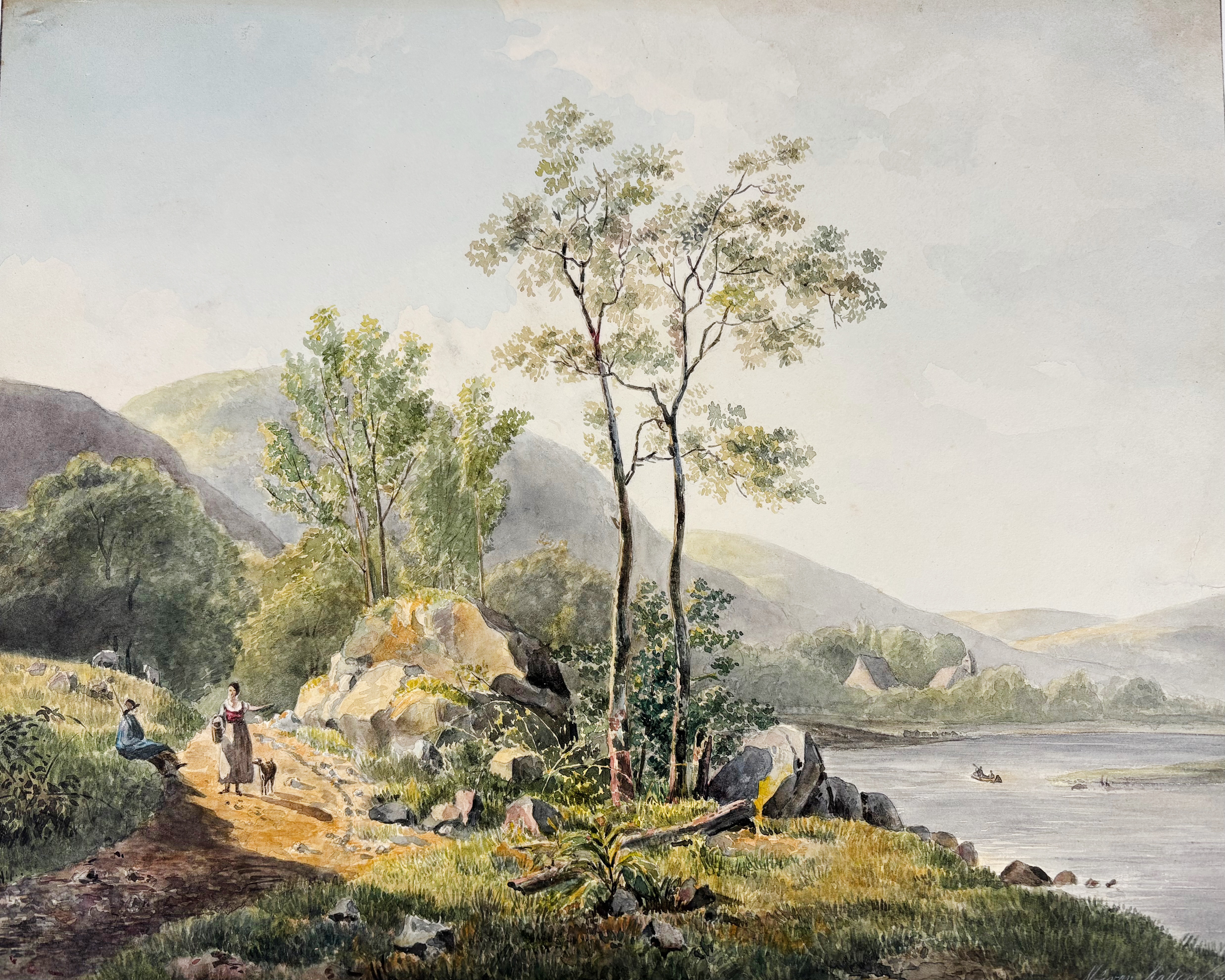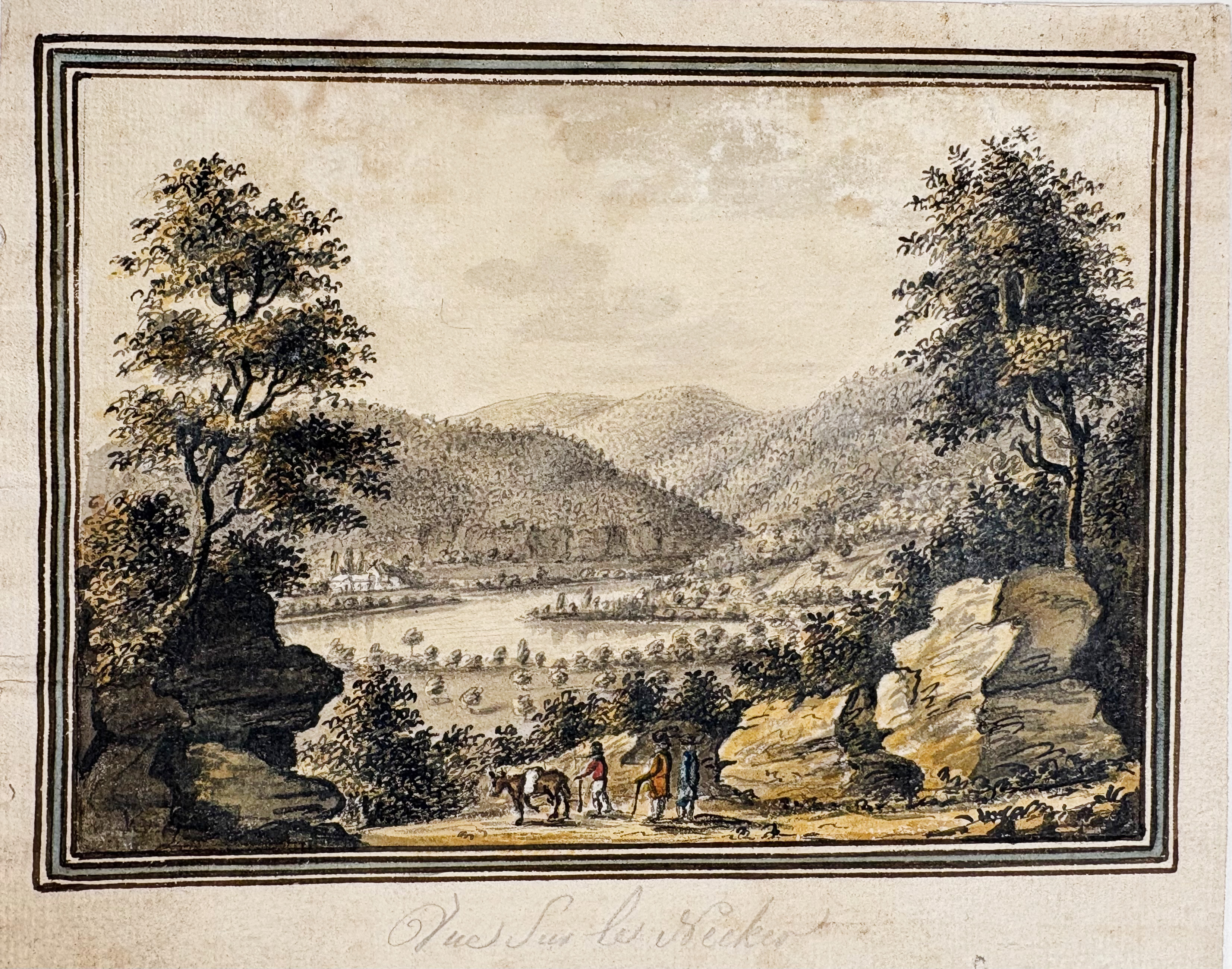 ITALIAN SCHOOL. (Landscape). 18th c. Drawing in red chalk and watercolour. 196 x 281 mm. Mounted along margins, under passepartout. NB On v° study of tree in pencil. -- Added: J.B.A.F.J. van AEFFERDEN (1767-1840)? "Vue sur le Necker". N.d. Watercolour. 145 x 180 mm. Hinged to mount, under passepartout. -- And 2 o. landscapes. (4).