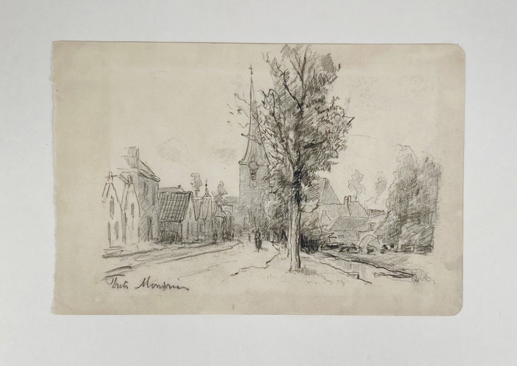 MONDRIAAN, Frédéric Hendrik ('Frits') (1853-1932). (Village view (Rijswijk?)). N.d. Drawing in pencil on paper. 155 x 232 mm. Signed in l.l. margin. Hinged to mount, under passepartout. -- Added: Id. (River landscape). N.d. Drawing in black chalk and colour wash. 170 x 224 mm. Signed in l.l. margin. Mounted along margins, under passepartout. -- (2).