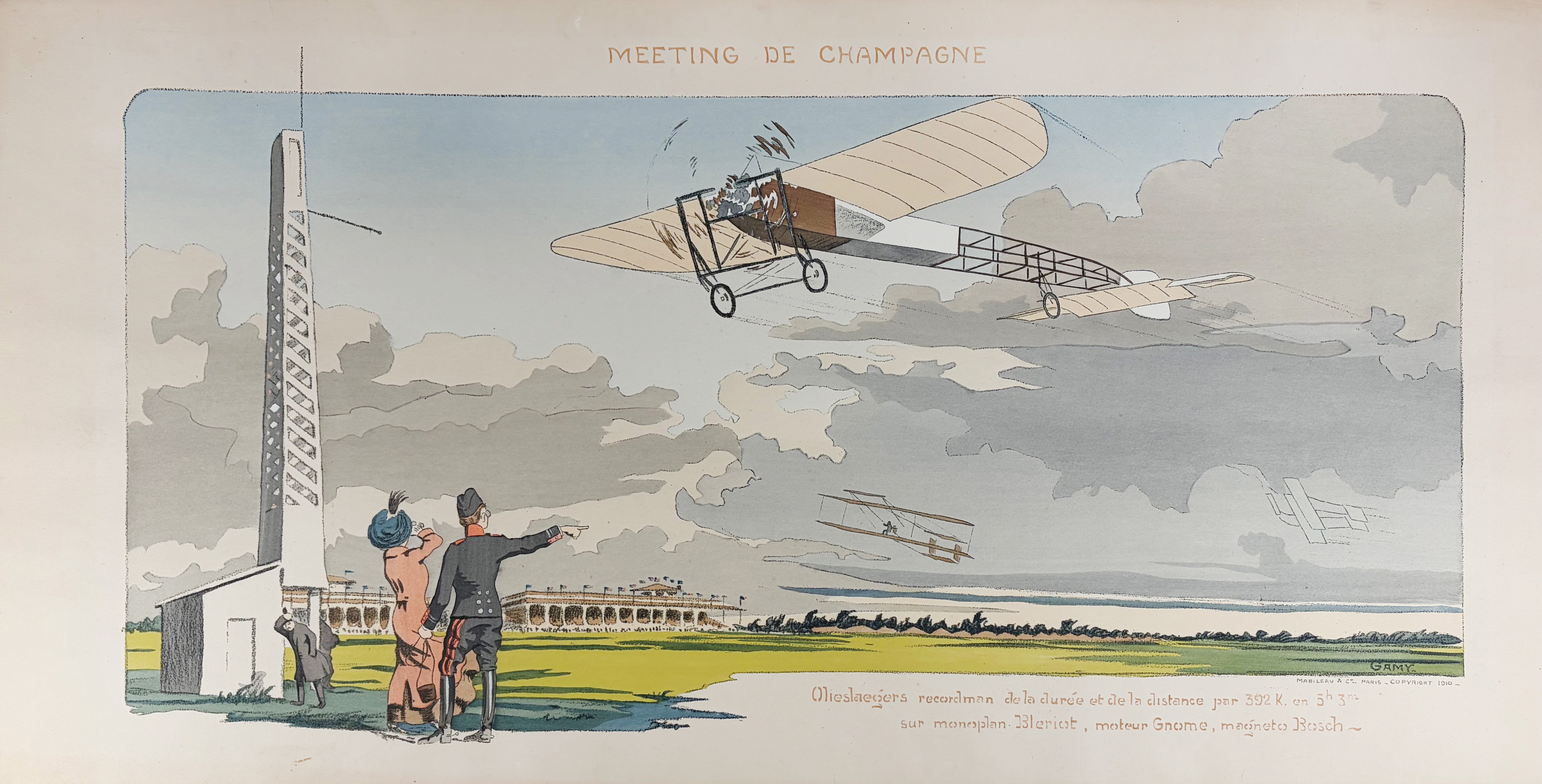 MONTAUT, Ernest (1879-1909). "Le dirigeable "République", moteur Panhard et Levassor". Paris, (c. 1900). Cold. lithogr., finished by hand. 445 x 898 mm. -- GAMY (=Marguerite Montaut). "Meeting de Champagne. Olieslaegers recordman de la durée et de la distance (...)." Paris, Mabileau, 1910. Cold. lithogr., finished by hand. 447 x 898 mm. -- (2).