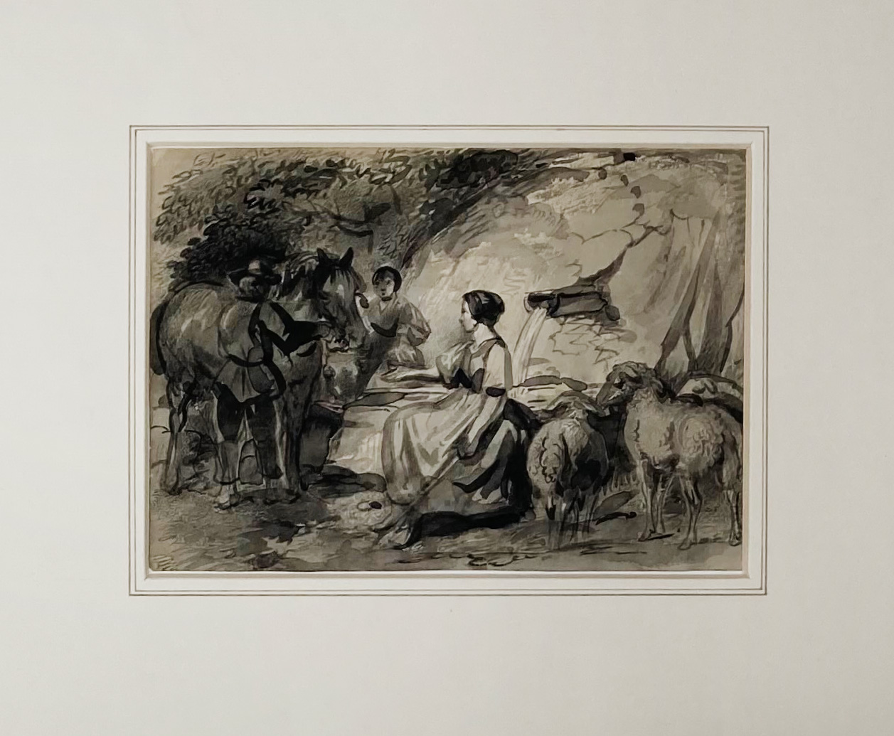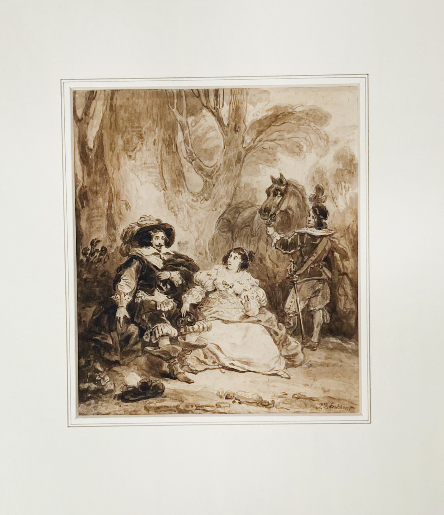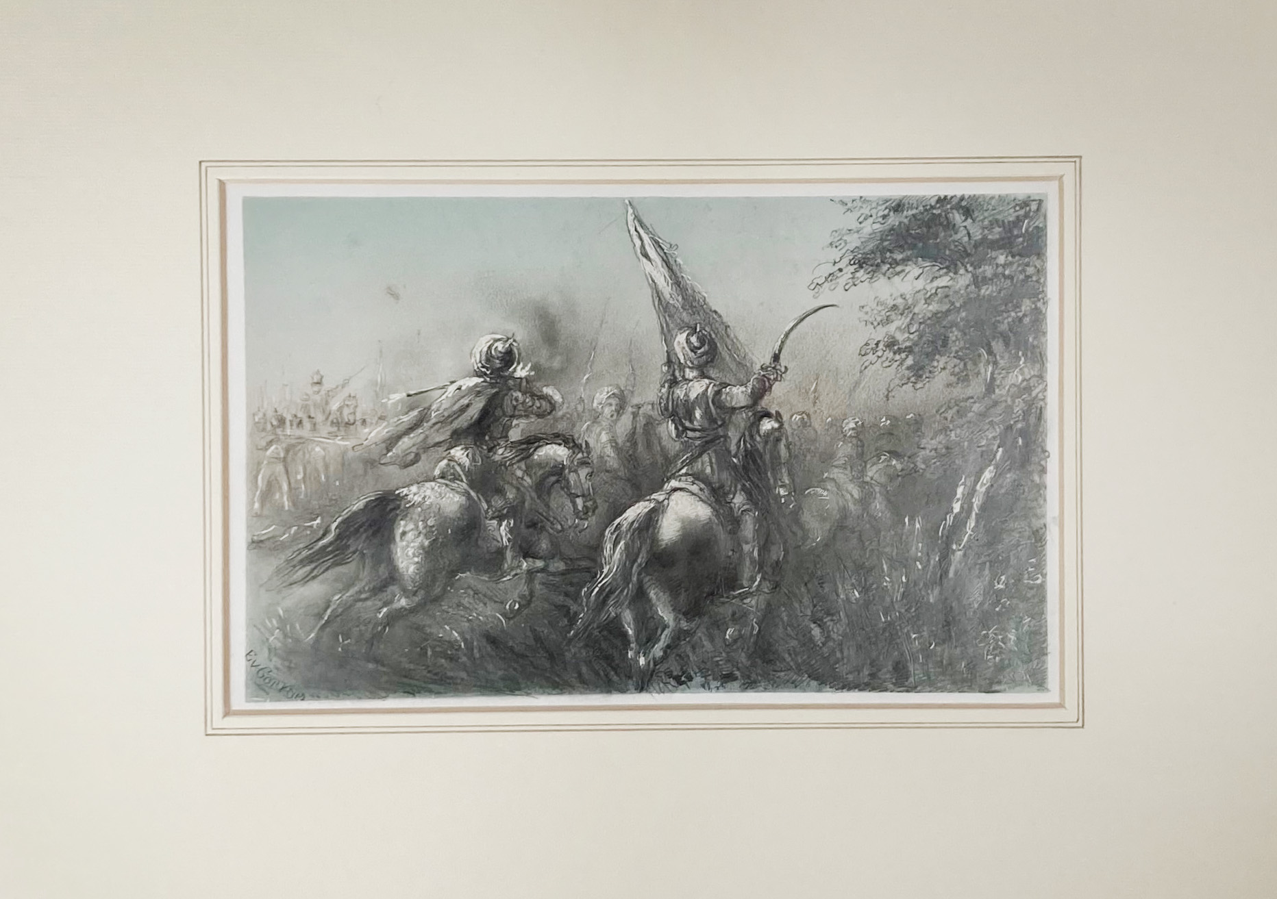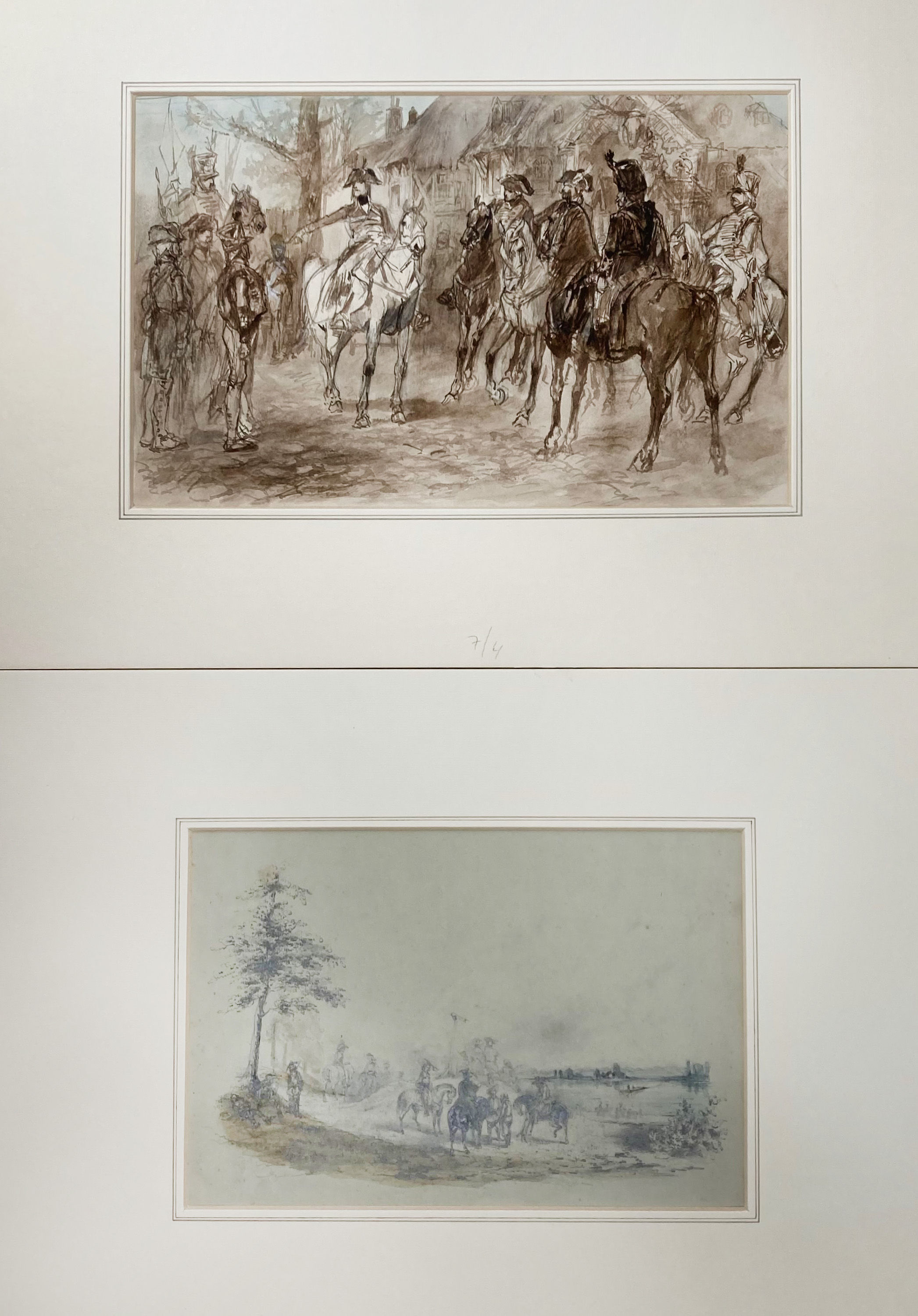 ROCHUSSEN, Charles (1814-1894), possibly. (Group of hussars on horseback (around Napoleon?)). N.d. Drawing in brown and light blue colour wash. 205 x 325 mm. Mounted along margins, under passepartout. -- Added: 5 drawings w. 'horse scenes'. -- (6).