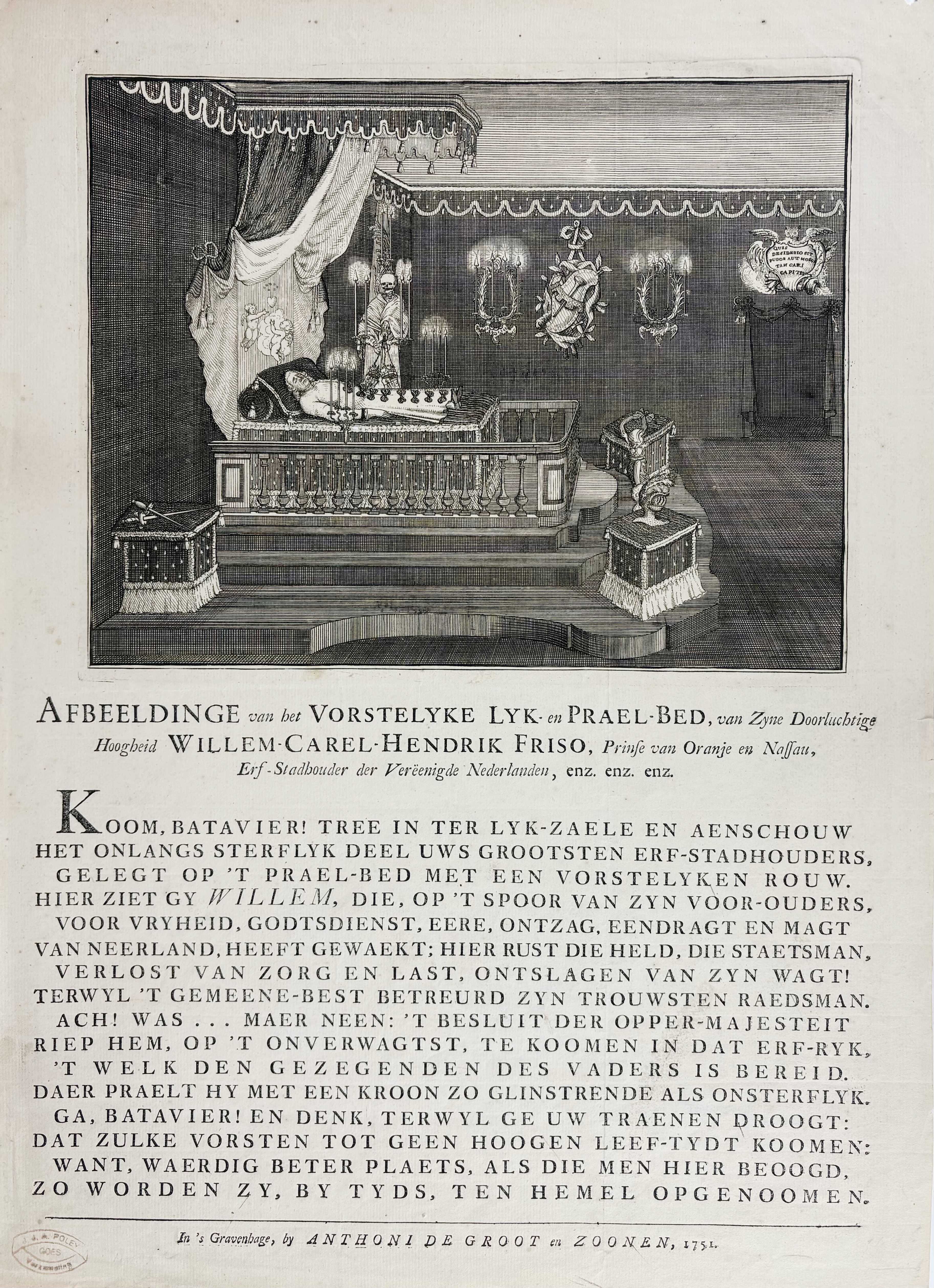 "SIC TRANSIT GLORIA MUNDI/mors ultima linea rerum". (c. 1712). Engr. on laid paper (no wm) after the 1655 print by C. v. Dalen/A. v.d. Venne. 330 x 445 mm. Men and women, including high-ranking individuals such as kings and queens, look into the opened tombs of historical figures (Croesus, Helena, Solomon, etc.) of whom only skeletons remain. All react with horror. From: J. Cats. 'Alle de wercken'. 1712. -- Added: "AFBEELDINGE van het Vorstelyke Lyk- en Prael-Bed, van (…) Willem-Carel-Hendrik Friso, (…)". 's-Grav., A. de Groot en Zn., 1751. Etching on top of letterpress text. 500 x 365 mm (sheet size). -- And 4 o. funerary prints. (6).