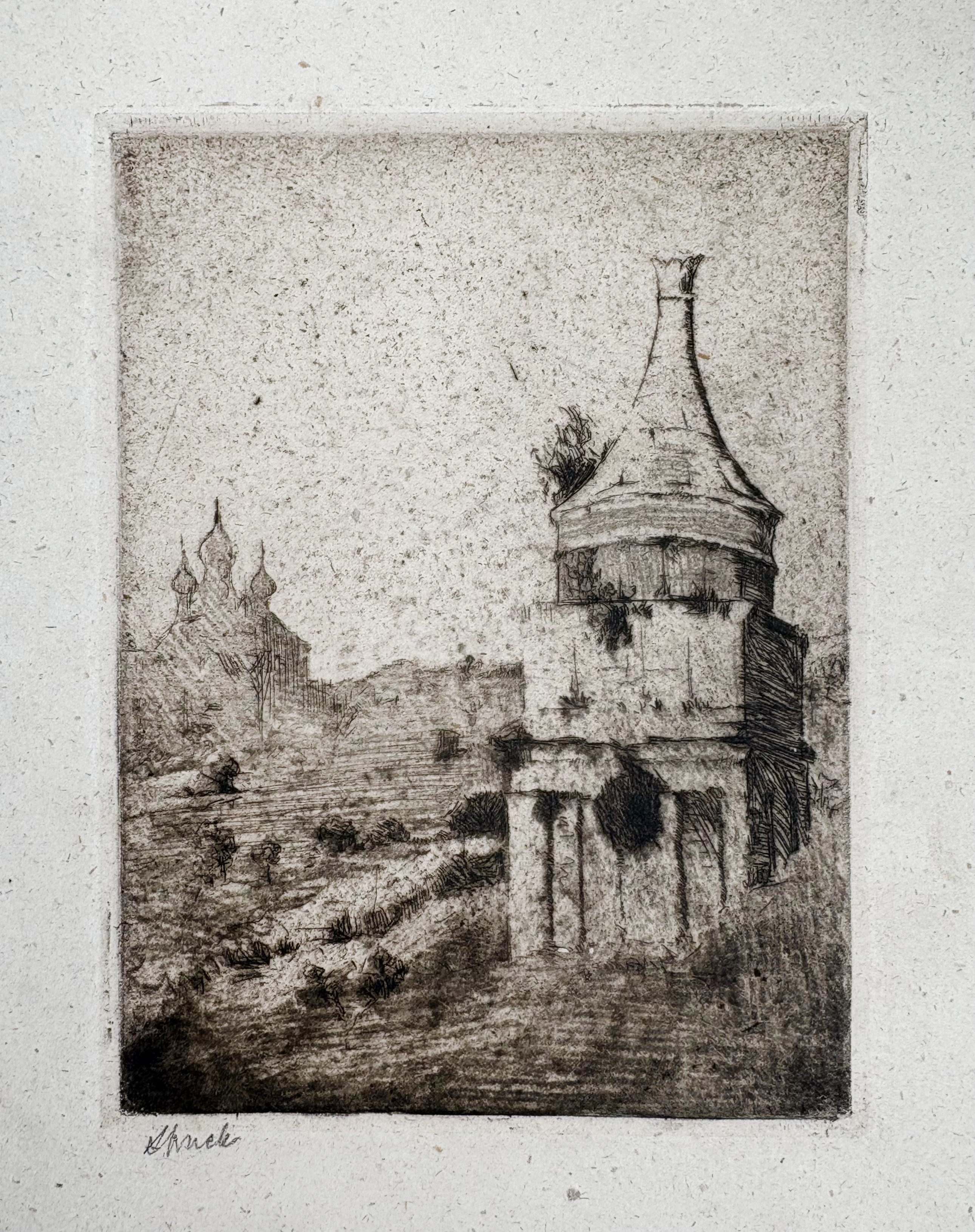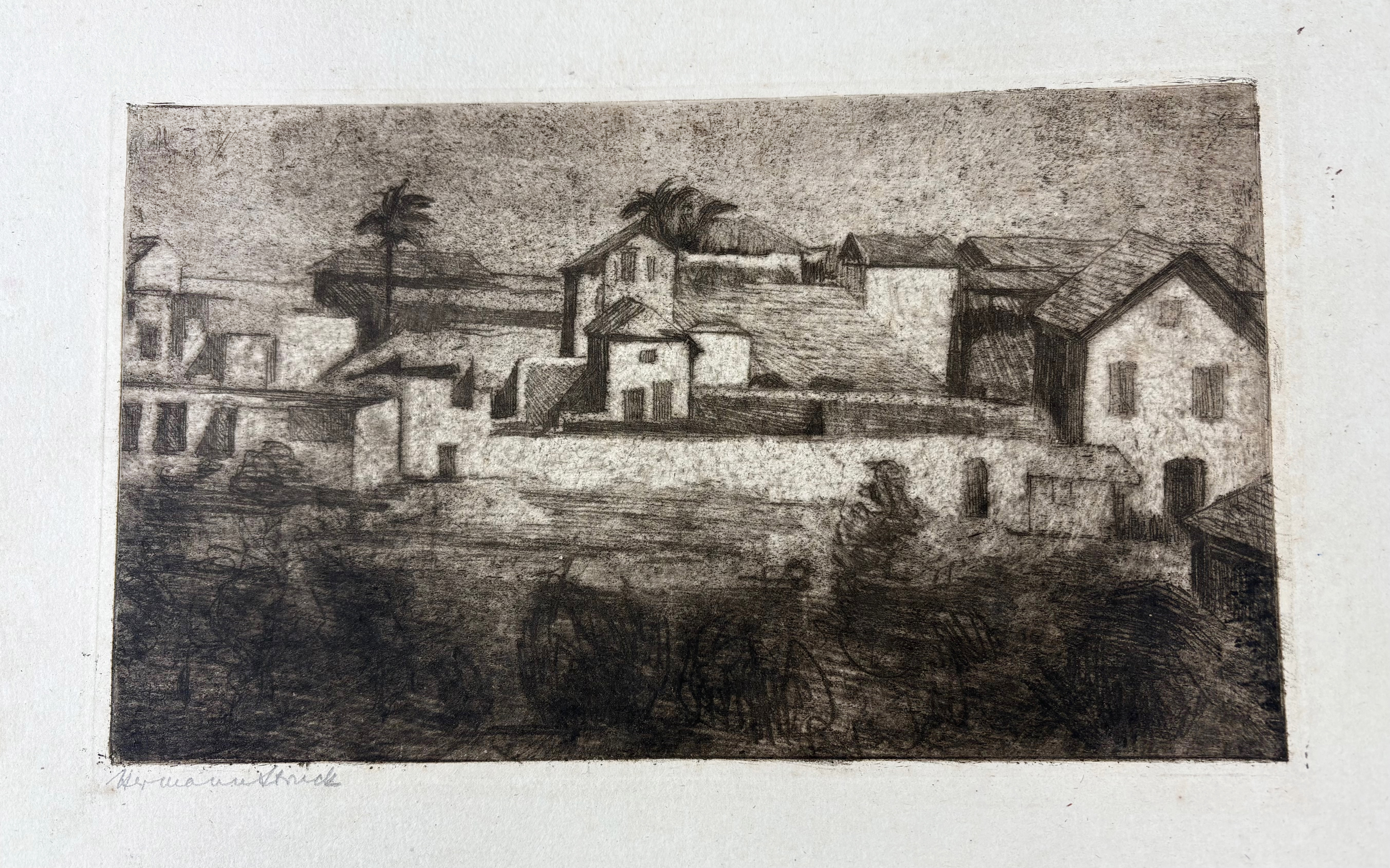 Hermann Struck undertook an extensive trip to the Land of Israel in 1903 of which he published a series of etchings, 9 of which are present here. Eight portray landscapes of the Land of Israel and one is a portrait (of a rabbi?). The passepartouts are 43 x 32 cm. Although the etchings are not numbered they were probably published in an edition of 100 copies.