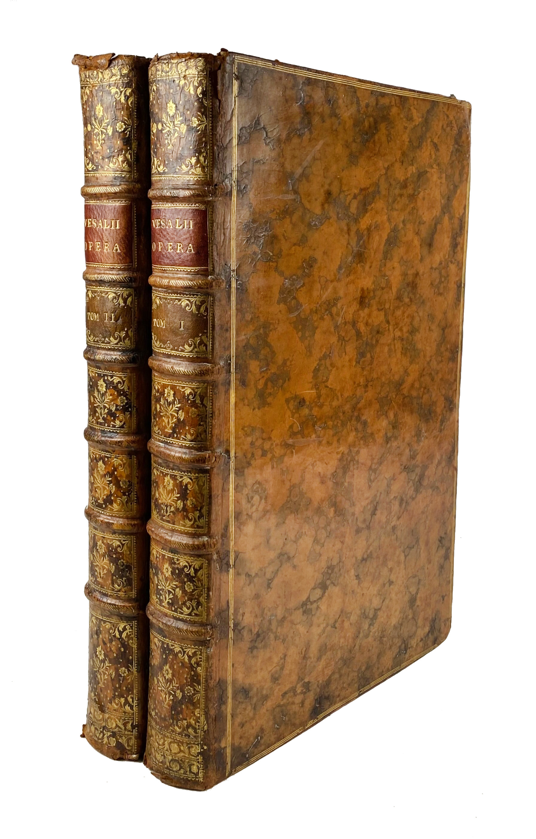ANATOMY -- VESALIUS, A. Opera omnia anatomica & chirurgica. Cura H. Boerhaave & B.S. Albini. Leiden, J. du Vivie and J. & H. Verbeek, 1725. 2 vols. (40), 572; (8), 577-1156, (51) pp. W. engr. ti., 2 engr. ti-vign., engr. portr. of the author, 82 fine engr. plates by J. Wandelaar after Van Calcar, and num. text-engrs. Fol. Fine cont. mottled cf. w. raised bands, richly dec. gilt backs, brown labels, & red edges. (Spine ends chipped/sl. dam., 2 upper corners vol. 2 skilfully rep., upper outer corner vol. 1 faintly stained in places, a bit browned/foxed in places, but a very good and complete set w. ample margins).