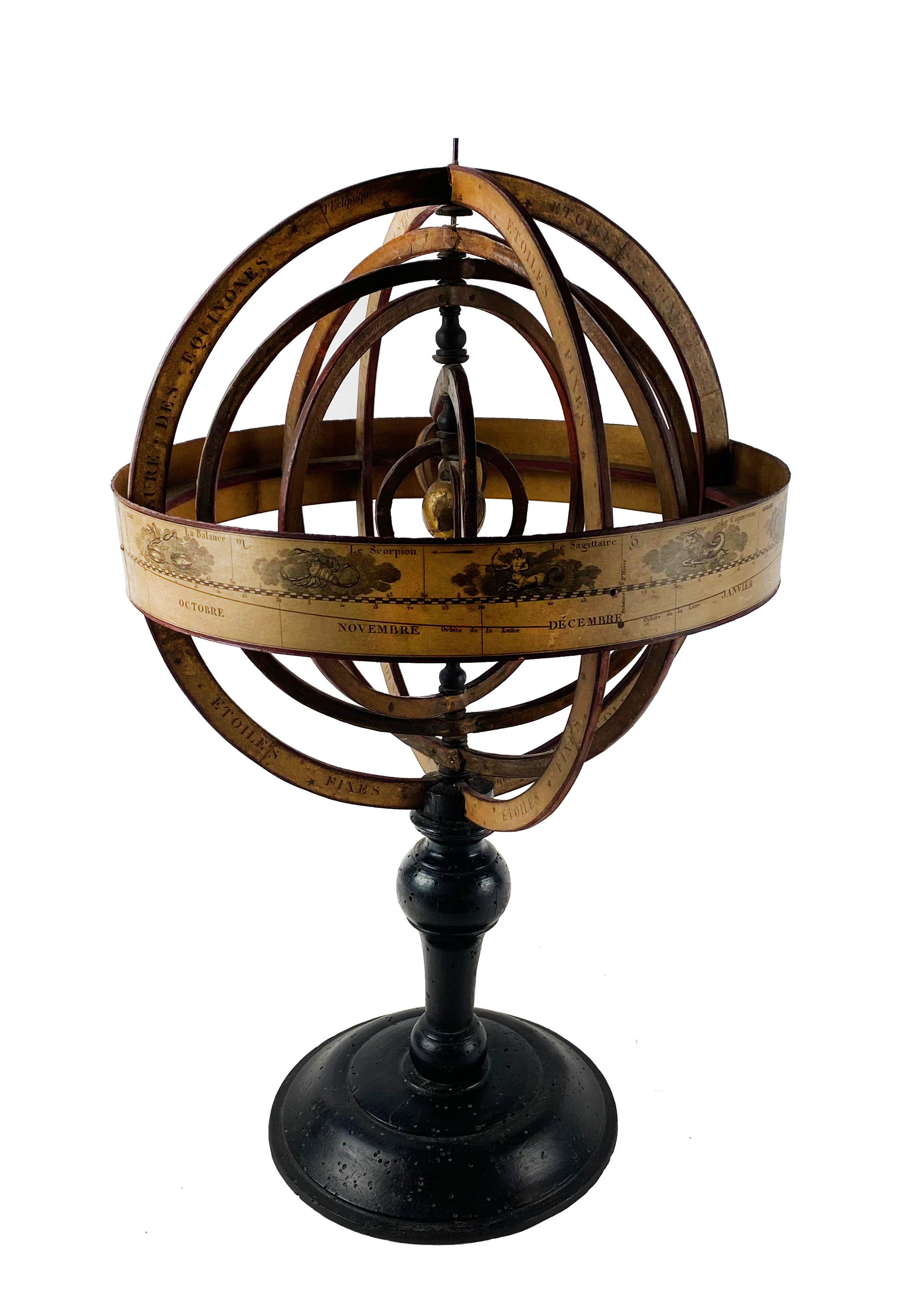 ARMILLARY SPHERE. France (?), 19th c. French wooden heliocentric sphere. Ø 285, 460 mm (h), incl. black wooden pedestal. (The pedestal shows signs of worming, the sphere itself a bit darkened, some of the gilding of the sun is worn, but altog. in good condition).