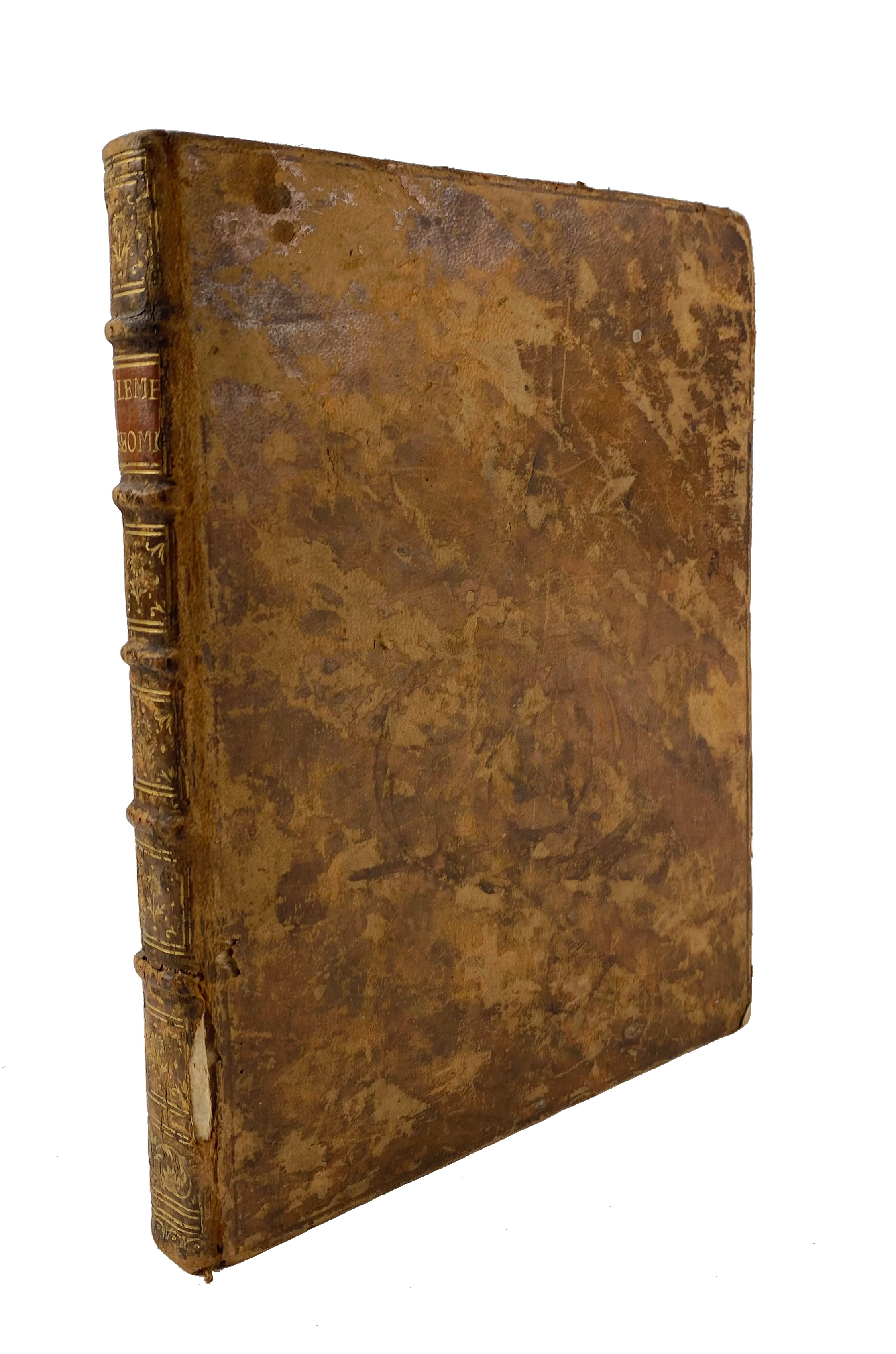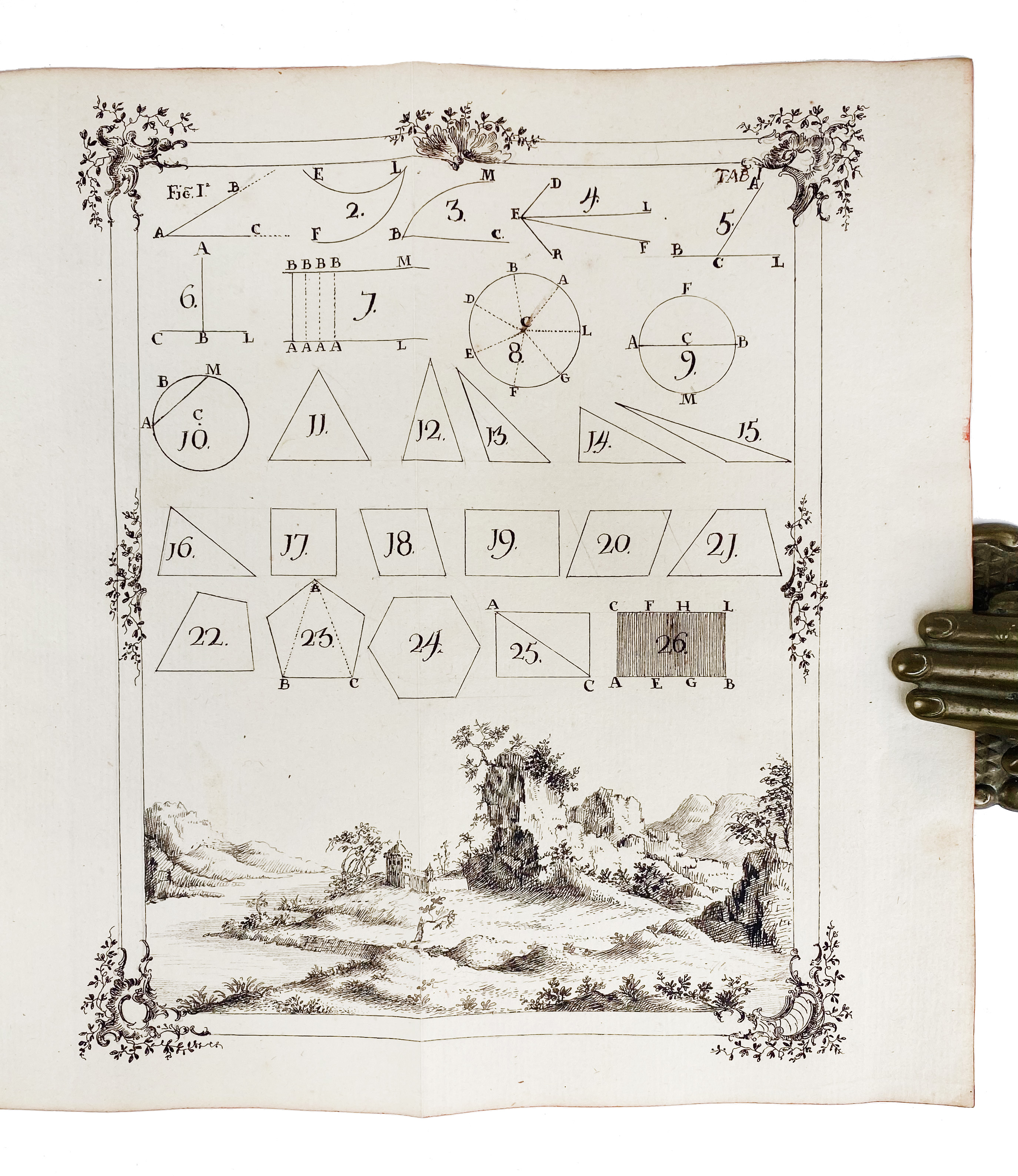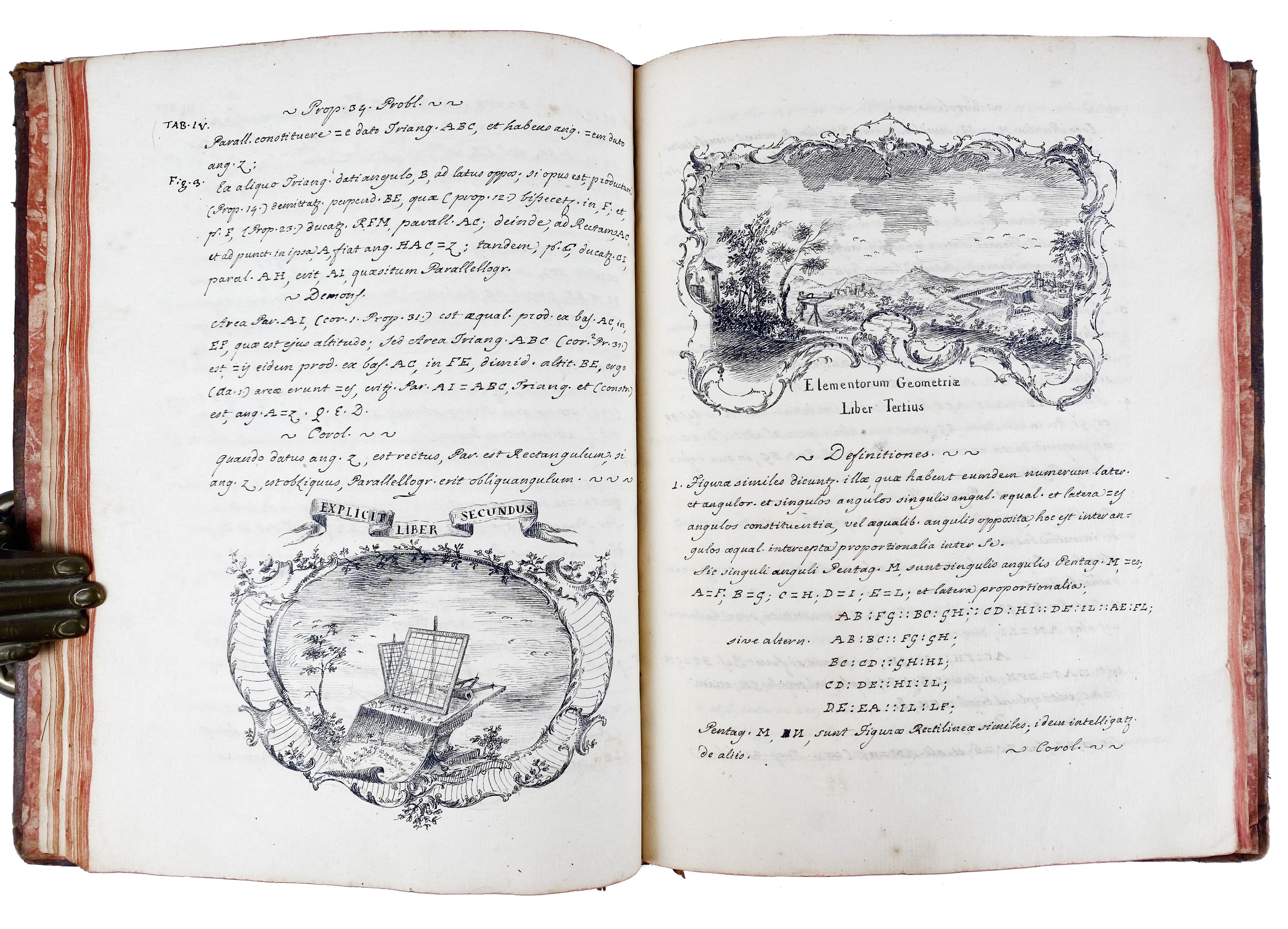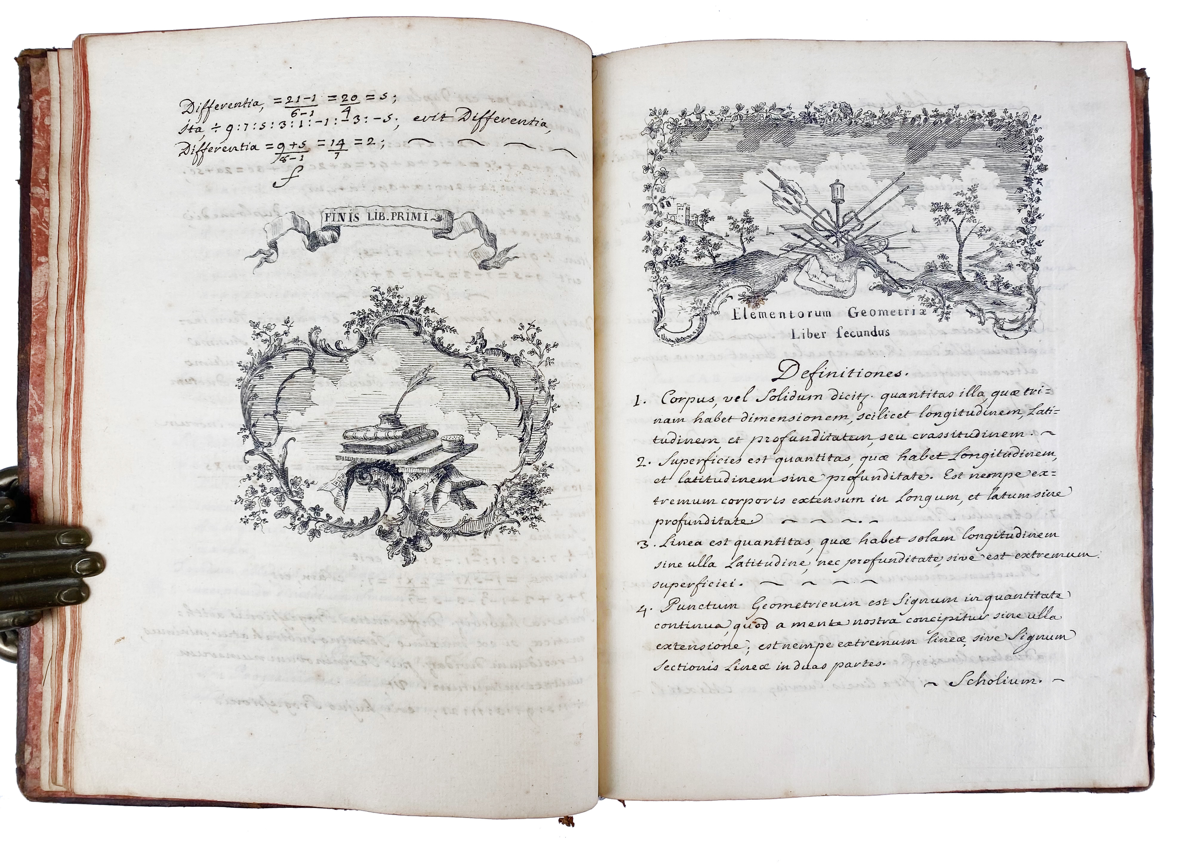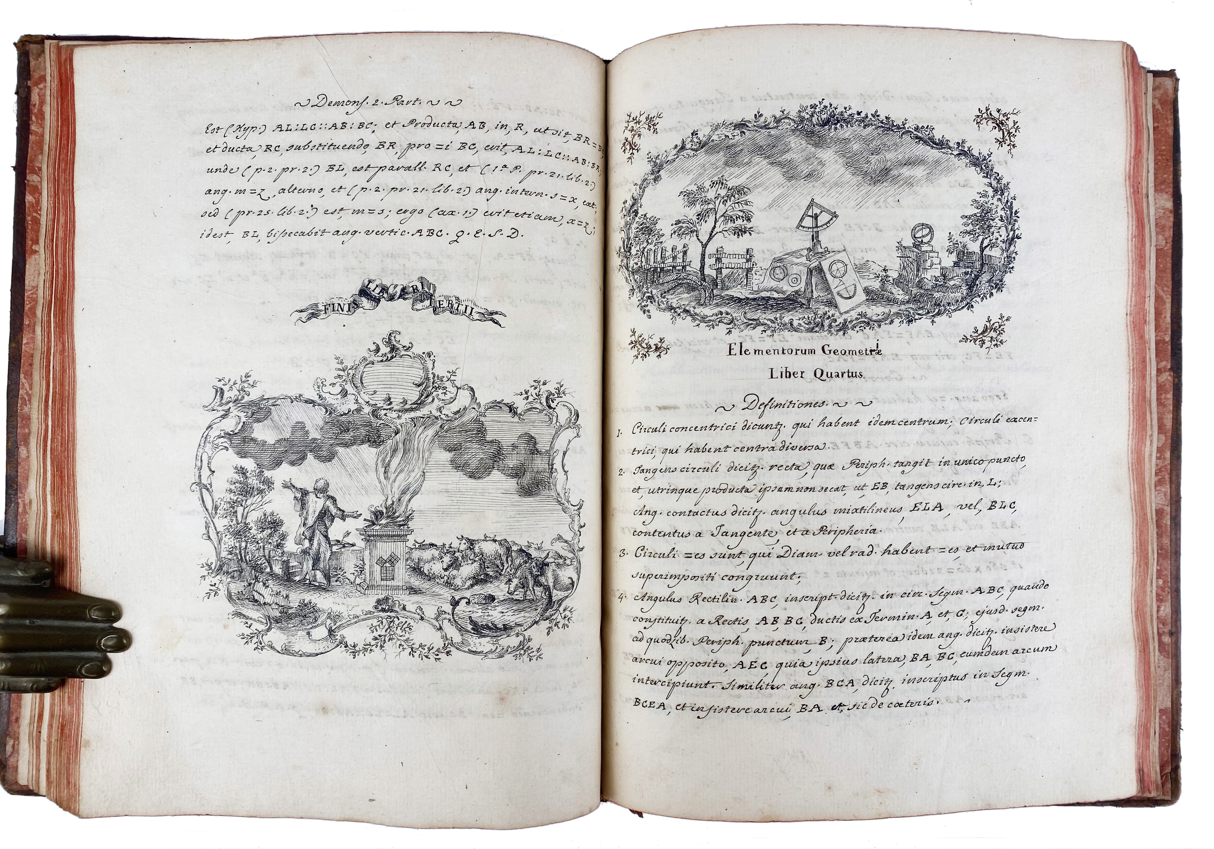 "ELEMENTA GEOMETRIÆ. Elementorum geometriæ liber primus doctrina proportionum et progressionum tum arithmethicarum tum geometricarum". (18th c.). Latin manuscript on paper. 93 lvs. (incl. 4 blanks). W. calligraphic title-page within an elaborate ornamental border and an allegorical scene, section title also within ornamental border, executed in pen and ink, text written in a neat and uniform hand with numerous beautiful executed allegorical vignettes, all executed in pen and ink. 4°. Cont. mottled cf. w. raised bands, dec. gilt spine, brown letterpiece, all edges red, marbled endpapers. (Spine a bit dam., corners worn, bind. chafed/rubbed).