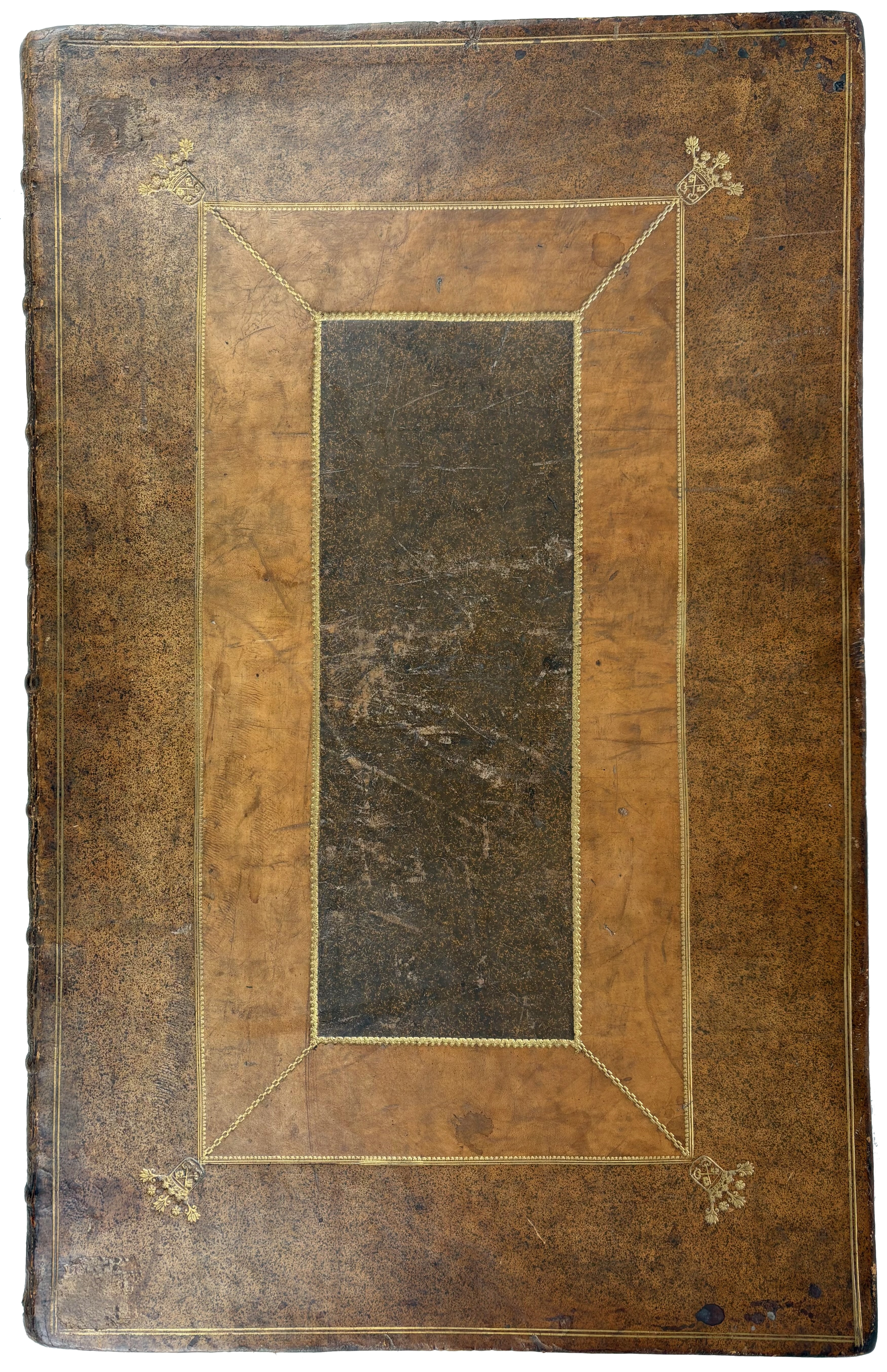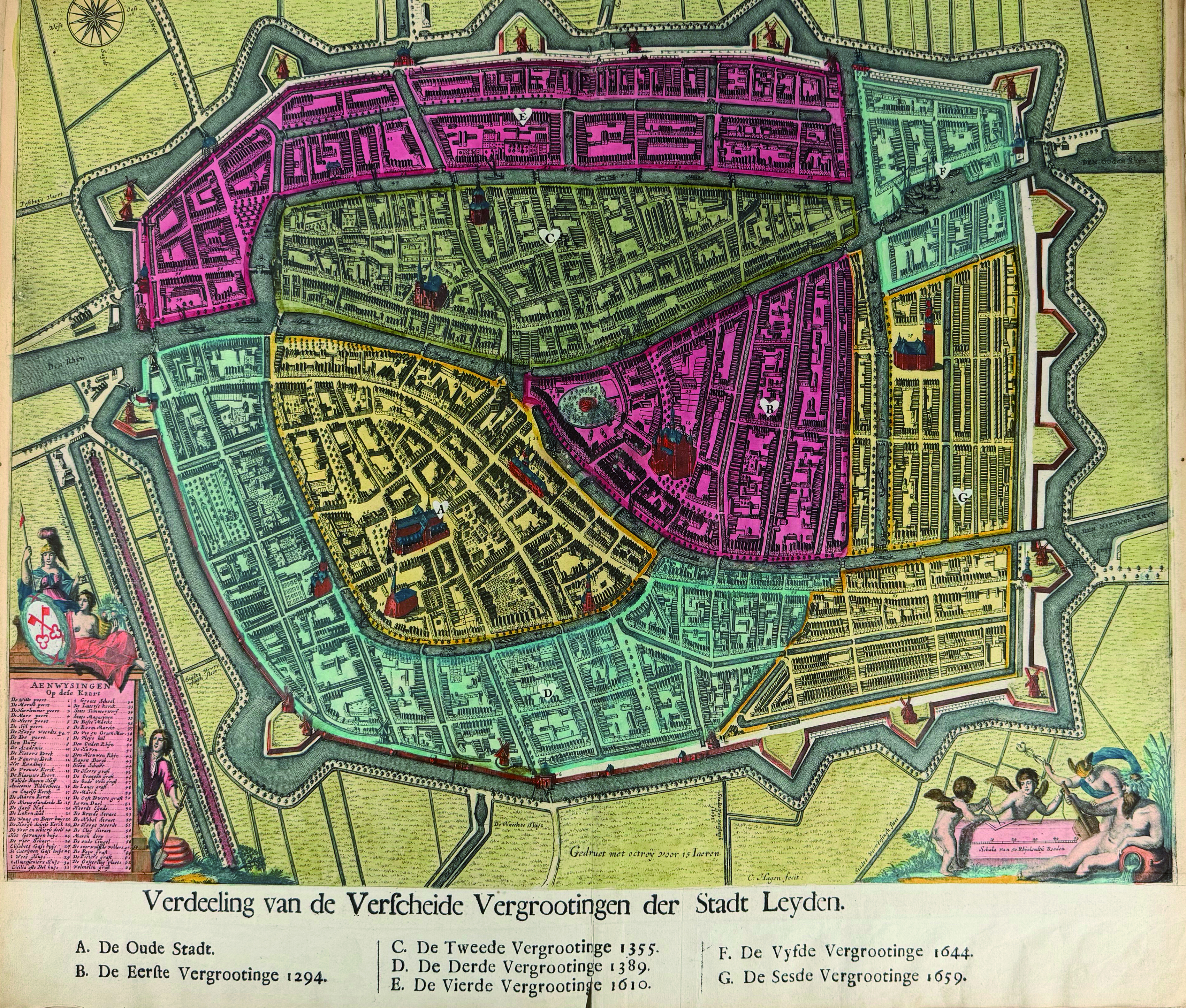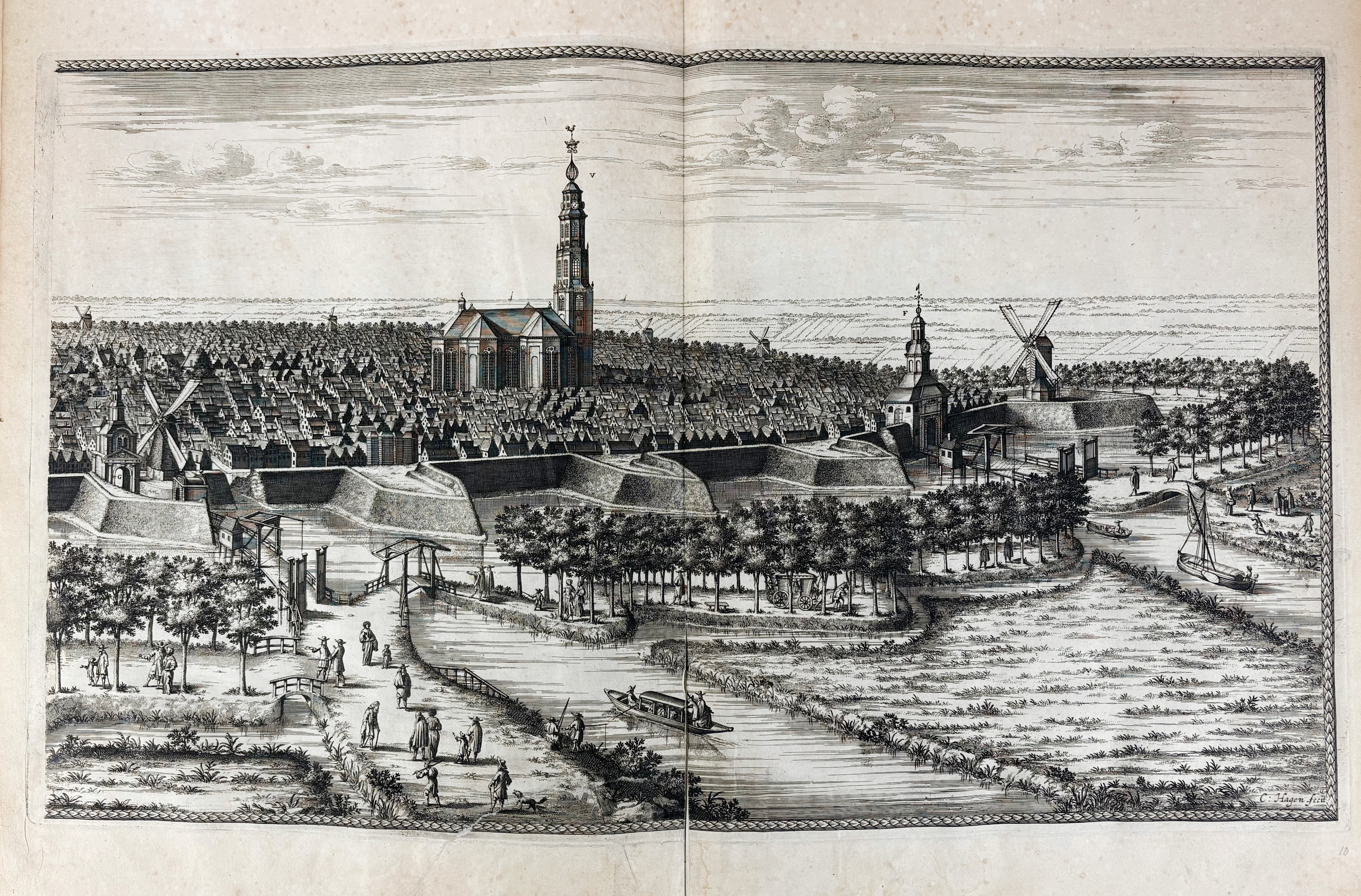LEIDEN -- "LUGDUNUM BATAVORUM Anno 1670". (Amst., 1674). Large engr. wall plan of Leiden printed on 14 double-p. lvs., comprising a large plan of Leiden on 4 lvs., a panorama view of the city from the South on 3 lvs. (1 w. small split in lower blank margin), tog. 9 views of important buildings on 4 lvs., and 3 lvs. w. the title and 5 armorial engr., all engr. by C. Hagen. - Bound up with: "LUGDUNUM BATAVORUM". (Leiden), 1675. Plain engr. plan of the city by C. Hagen 'crowned' by 4 family crests (representing the mayors of Leiden) and the city arms, on top of a perspective view of the city seen from the South (NB without the 16 views on churches, gates, the academy building, etc.). - Also bound up with 4 copies of the central plan of the 'kleine Hagen' of 1675 in full cont. colouring w. letterpress captions attached to the lower margin: "Verdeeling van de Verscheide Vergrootingen der Stadt Leyden" - "Verdeelinge en Naamen van de XXVII Bonnen der Stadt Leyden" - "Verdeelinge van de acht Compagnien ofte Vaendels Schutterye, (…)" - "Verdeelinge en Namen van de Qartieren der Huyszitten-Meesters". - Tog. 16 double-p. and 4 full-p. plates in 1 binding. Lge-fol. 18th c. panelled and mottled cf., covers w. gilt ornamental rules, all corners w. gilt coats of arms of Leiden. (Plan of 'Grote Hagen' unfortunately w. rather clumsily closed tears and rumpled in places, no loss of image however).