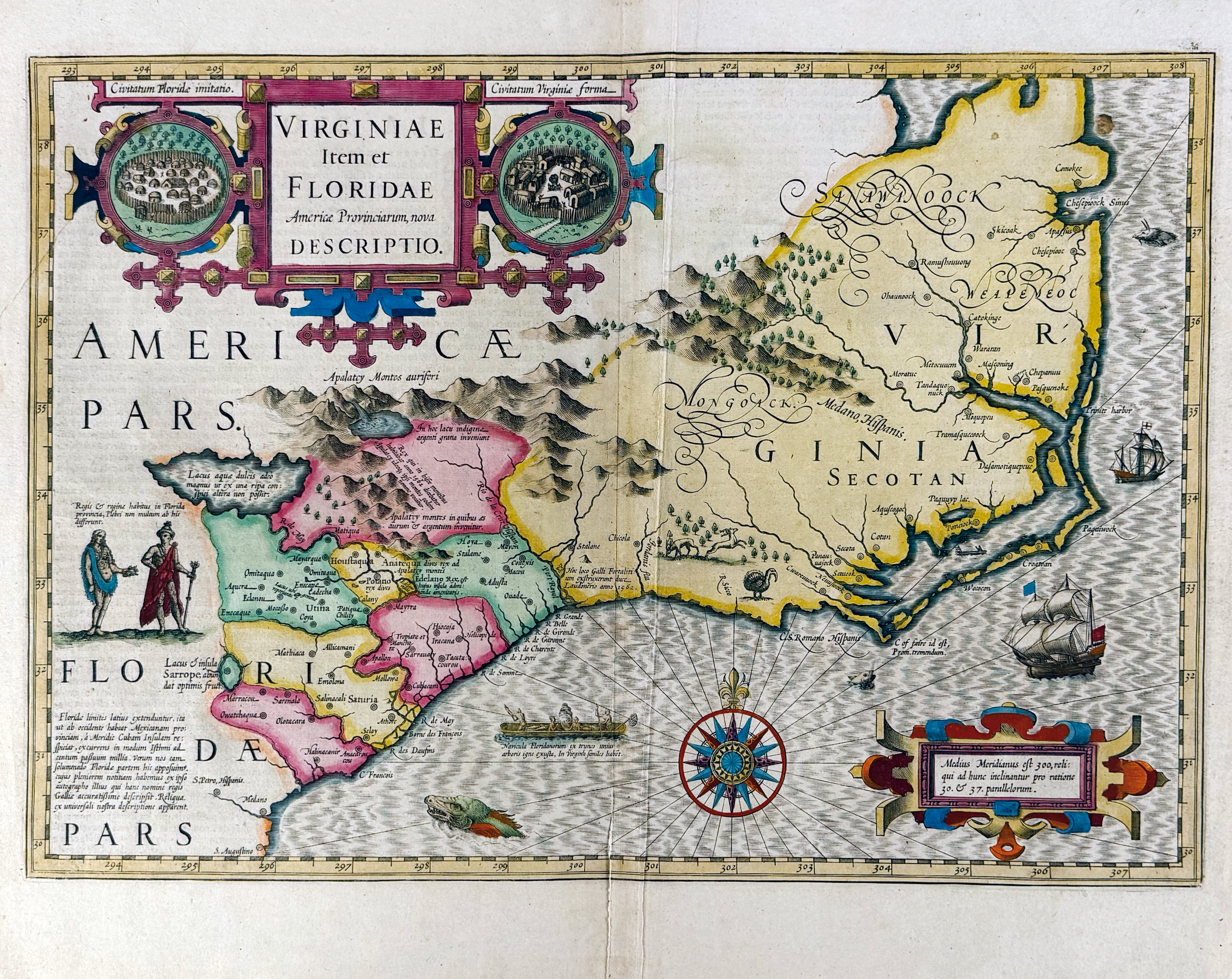 AMERICA -- "VIRGINIAE ITEM ET FLORIDAE Americae Provinciarum, nova descriptio". (Amst., J. Hondius, 1619). Fine engr. map in cont. colouring. 350 x 492 mm. (Partly split on vertical fold, but in v.g. condition).
